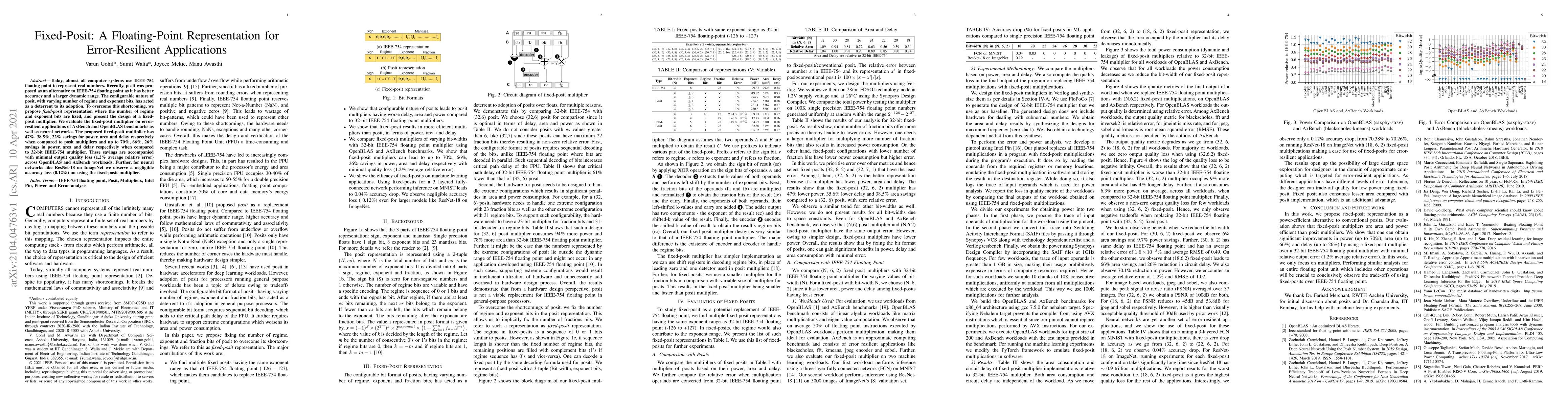 The paper proposes a fixed-posit representation to simplify the adoption of posit over IEEE-754, presenting a fixed-bit multiplier design that achieves significant power, area, and delay savings while maintaining minimal output quality loss and negligible accuracy reduction in applications like neural networks.