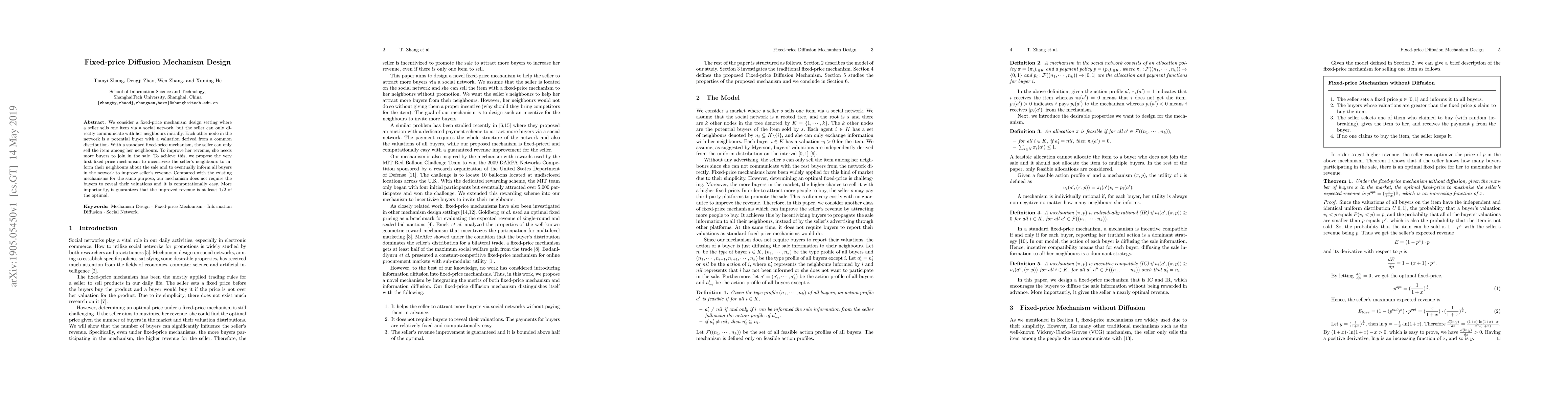We consider a fixed-price mechanism design setting where a seller sells one item via a social network, but the seller can only directly communicate with her neighbours initially. Each other node in the network is a potential buyer with a valuation derived from a common distribution. With a standard fixed-price mechanism, the seller can only sell the item among her neighbours. To improve her revenue, she needs more buyers to join in the sale. To achieve this, we propose the very first fixed-price mechanism to incentivize the seller's neighbours to inform their neighbours about the sale and to eventually inform all buyers in the network to improve seller's revenue. Compared with the existing mechanisms for the same purpose, our mechanism does not require the buyers to reveal their valuations and it is computationally easy. More importantly, it guarantees that the improved revenue is at least 1/2 of the optimal.