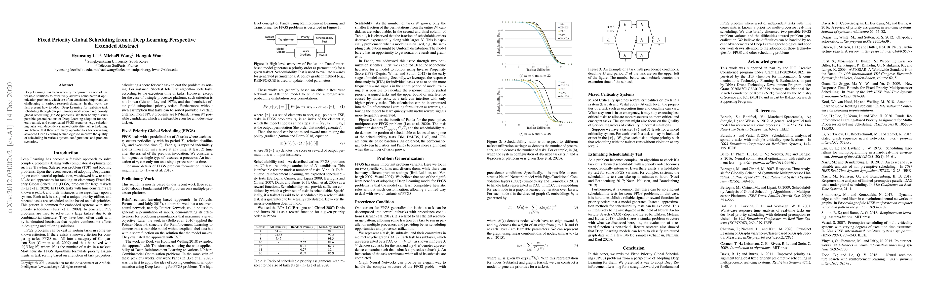 Deep Learning has been recently recognized as one of the feasible solutions to effectively address combinatorial optimization problems, which are often considered important yet challenging in various research domains. In this work, we first present how to adopt Deep Learning for real-time task scheduling through our preliminary work upon fixed priority global scheduling (FPGS) problems. We then briefly discuss possible generalizations of Deep Learning adoption for several realistic and complicated FPGS scenarios, e.g., scheduling tasks with dependency, mixed-criticality task scheduling. We believe that there are many opportunities for leveraging advanced Deep Learning technologies to improve the quality of scheduling in various system configurations and problem scenarios.