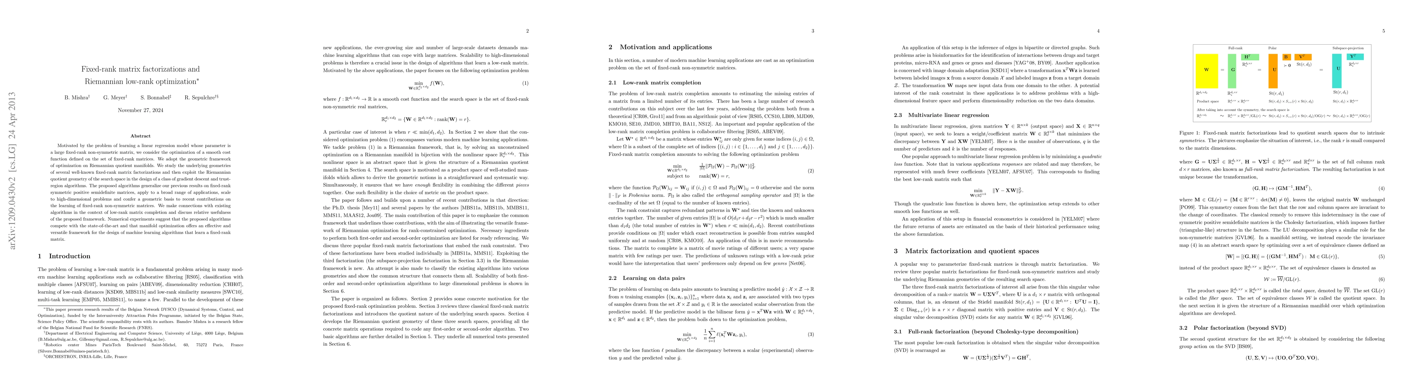 Motivated by the problem of learning a linear regression model whose parameter is a large fixed-rank non-symmetric matrix, we consider the optimization of a smooth cost function defined on the set of fixed-rank matrices. We adopt the geometric framework of optimization on Riemannian quotient manifolds. We study the underlying geometries of several well-known fixed-rank matrix factorizations and then exploit the Riemannian quotient geometry of the search space in the design of a class of gradient descent and trust-region algorithms. The proposed algorithms generalize our previous results on fixed-rank symmetric positive semidefinite matrices, apply to a broad range of applications, scale to high-dimensional problems and confer a geometric basis to recent contributions on the learning of fixed-rank non-symmetric matrices. We make connections with existing algorithms in the context of low-rank matrix completion and discuss relative usefulness of the proposed framework. Numerical experiments suggest that the proposed algorithms compete with the state-of-the-art and that manifold optimization offers an effective and versatile framework for the design of machine learning algorithms that learn a fixed-rank matrix.