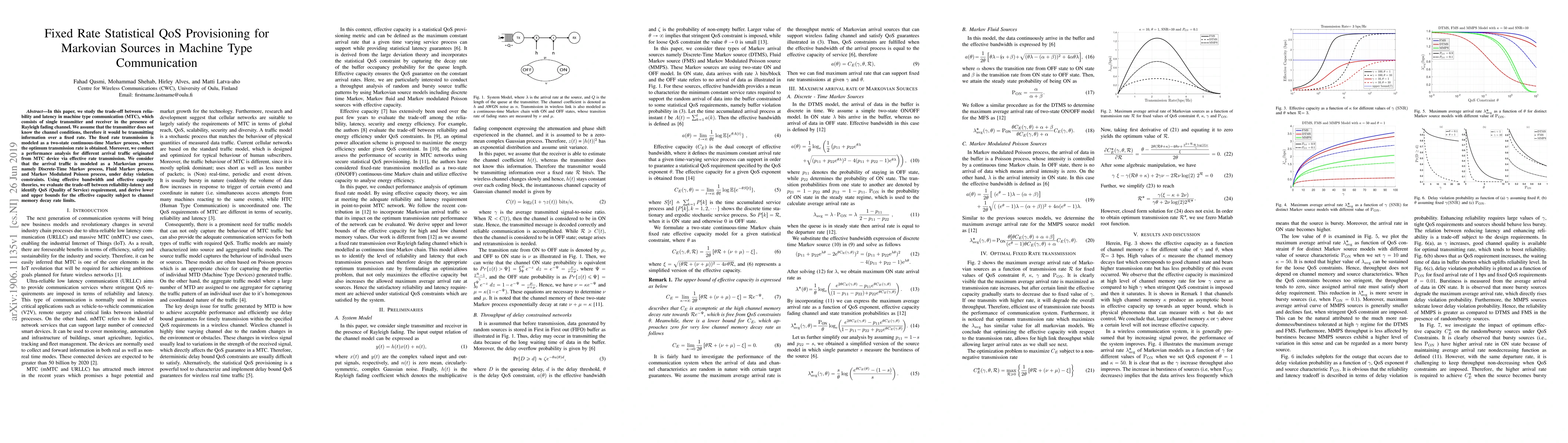 This paper explores the trade-off between reliability and latency in machine type communication, proposing a fixed rate statistical QoS provisioning method for Markovian sources in Rayleigh fading channels. It derives bounds for effective capacity subject to channel memory decay rate limits.
