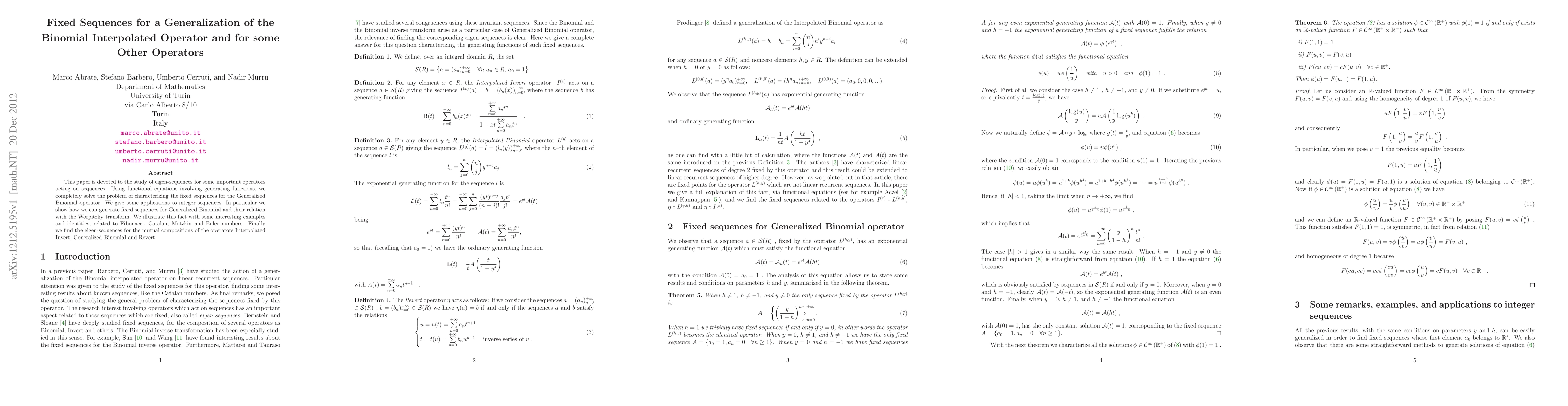 This paper characterizes fixed sequences for the Generalized Binomial operator and related operators using functional equations, and explores applications to integer sequences, including connections to Fibonacci, Catalan, Motzkin, and Euler numbers. It also identifies eigen-sequences for compositions of the Interpolated Invert, Generalized Binomial, and Revert operators.