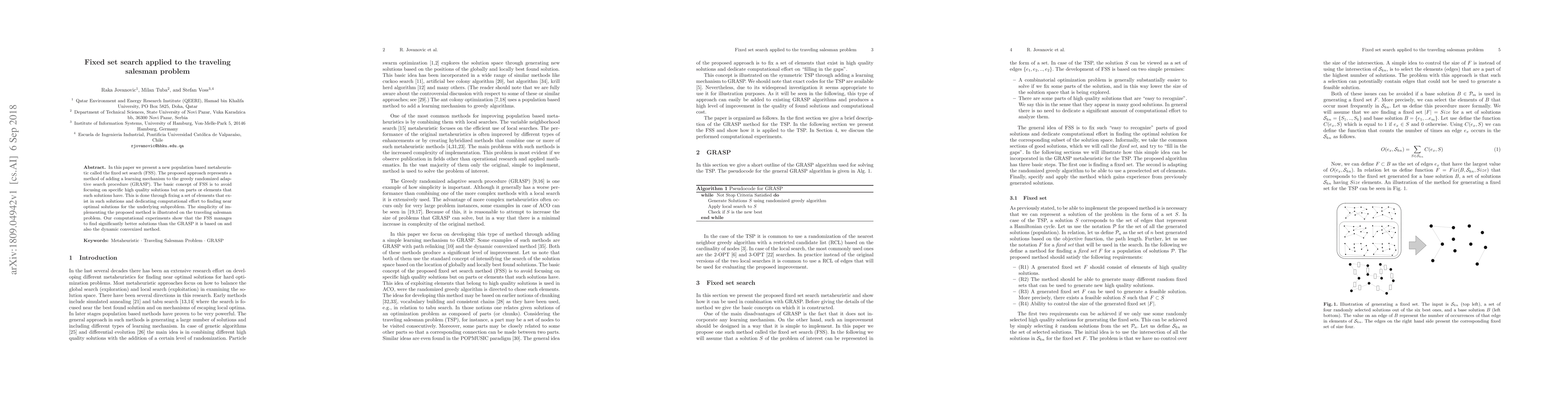In this paper we present a new population based metaheuristic called the fixed set search (FSS). The proposed approach represents a method of adding a learning mechanism to the greedy randomized adaptive search procedure (GRASP). The basic concept of FSS is to avoid focusing on specific high quality solutions but on parts or elements that such solutions have. This is done through fixing a set of elements that exist in such solutions and dedicating computational effort to finding near optimal solutions for the underlying subproblem. The simplicity of implementing the proposed method is illustrated on the traveling salesman problem. Our computational experiments show that the FSS manages to find significantly better solutions than the GRASP it is based on and also the dynamic convexized method.