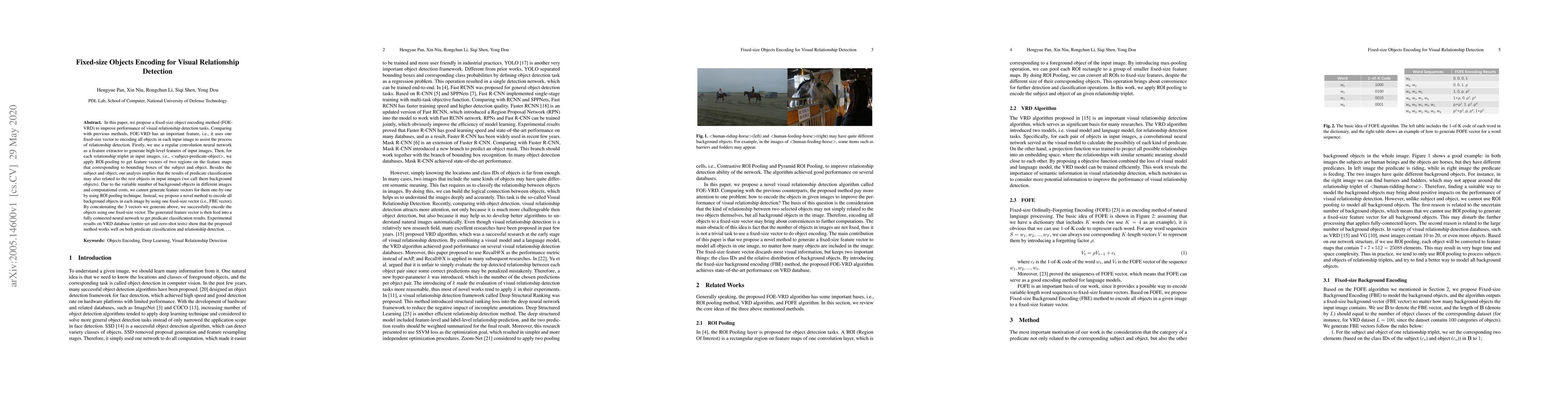 This research introduces FOE-VRD, a method that encodes all objects in an image, including background ones, into a single fixed-size vector for visual relationship detection. It uses a CNN for feature extraction, ROI pooling for subject and object features, and a novel approach for background objects, resulting in improved predicate classification and relationship detection performance on the VRD database.