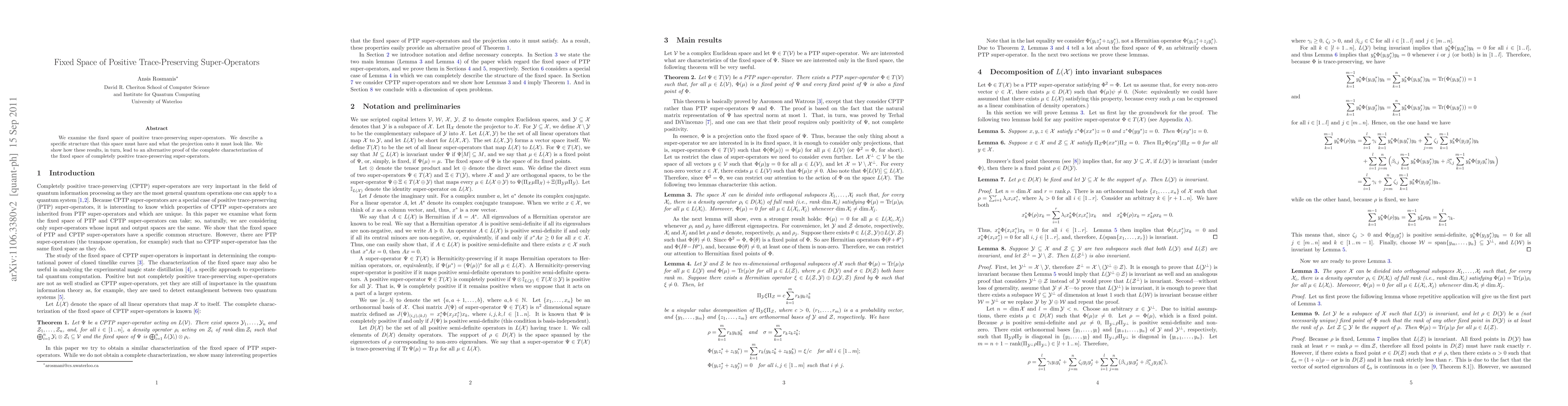 The paper presents a detailed analysis of the fixed space of positive trace-preserving super-operators, providing a lemma that characterizes this space and an alternative proof for completely positive trace-preserving super-operators.