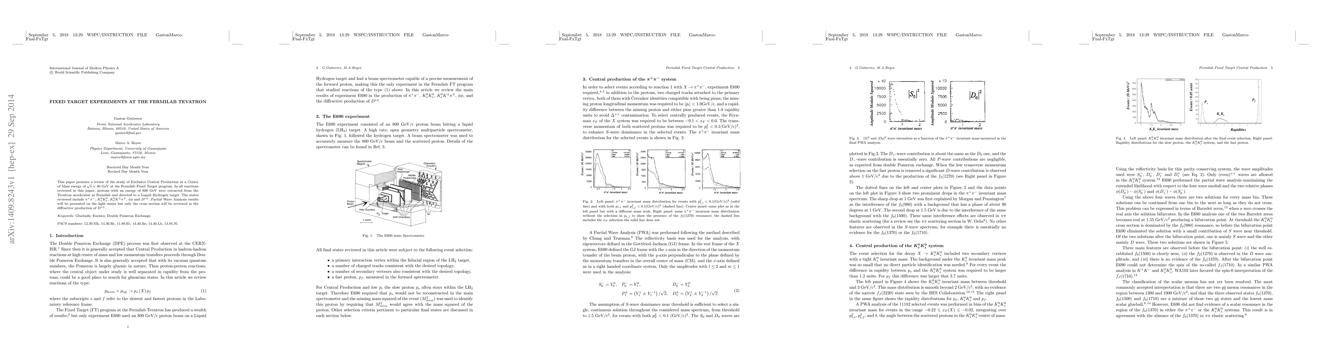This paper reviews exclusive central production studies at $\sqrt{s}=40$ GeV using 800 GeV protons from the Fermilab Tevatron directed at a Liquid Hydrogen target, focusing on states like $\pi^+\pi^-$, $K^0_s K^0_s$, and $D^{*\pm}$, with detailed partial wave analysis for light states.