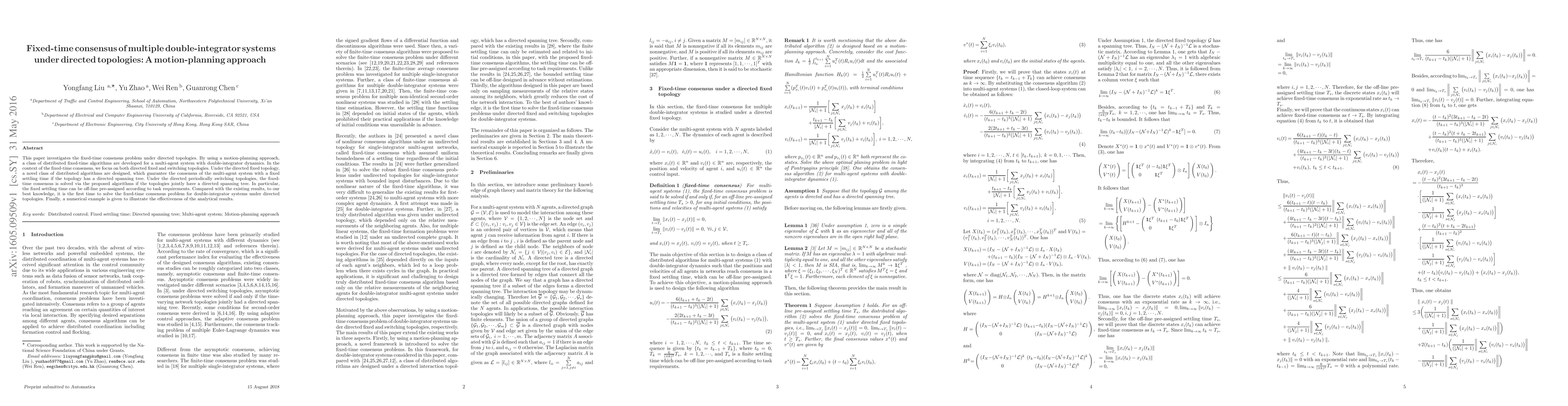 This paper investigates the fixed-time consensus problem under directed topologies. By using a motion-planning approach, a class of distributed fixed-time algorithms are developed for a multi-agent system with double-integrator dynamics. In the context of the fixed-time consensus, we focus on both directed fixed and switching topologies. Under the directed fixed topology, a novel class of distributed algorithms are designed, which guarantee the consensus of the multi-agent system with a fixed settling time if the topology has a directed spanning tree. Under the directed periodically switching topologies, the fixedtime consensus is solved via the proposed algorithms if the topologies jointly have a directed spanning tree. In particular, the fixed settling time can be off-line pre-assigned according to task requirements. Compared with the existing results, to our best knowledge, it is the first time to solve the fixed-time consensus problem for double-integrator systems under directed topologies. Finally, a numerical example is given to illustrate the effectiveness of the analytical results.