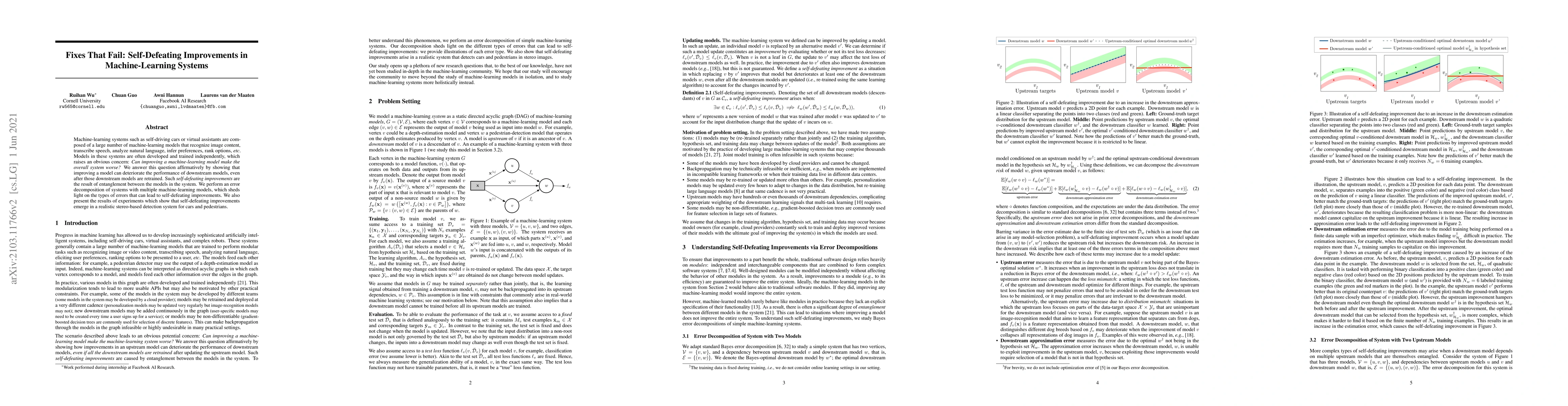 Machine-learning systems such as self-driving cars or virtual assistants are composed of a large number of machine-learning models that recognize image content, transcribe speech, analyze natural language, infer preferences, rank options, etc. Models in these systems are often developed and trained independently, which raises an obvious concern: Can improving a machine-learning model make the overall system worse? We answer this question affirmatively by showing that improving a model can deteriorate the performance of downstream models, even after those downstream models are retrained. Such self-defeating improvements are the result of entanglement between the models in the system. We perform an error decomposition of systems with multiple machine-learning models, which sheds light on the types of errors that can lead to self-defeating improvements. We also present the results of experiments which show that self-defeating improvements emerge in a realistic stereo-based detection system for cars and pedestrians.