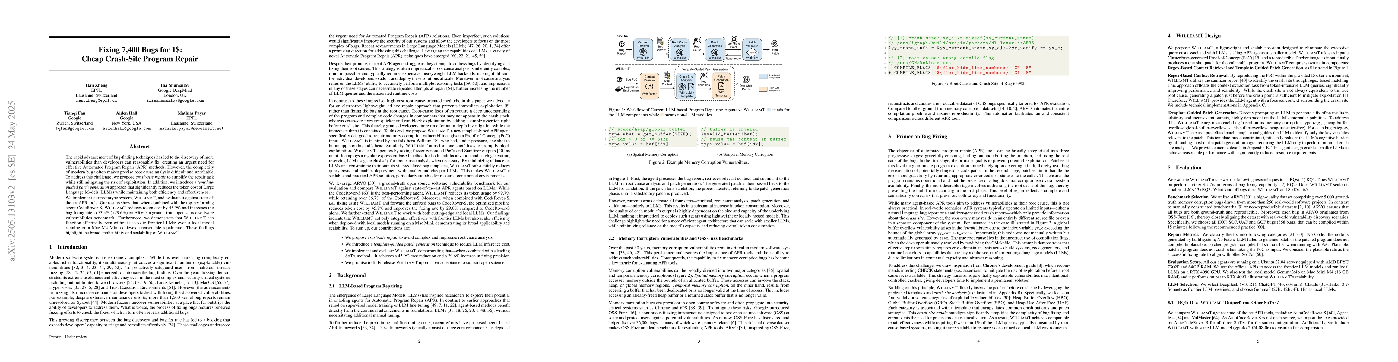 The rapid advancement of bug-finding techniques has led to the discovery of more vulnerabilities than developers can reasonably fix, creating an urgent need for effective Automated Program Repair (APR) methods. However, the complexity of modern bugs often makes precise root cause analysis difficult and unreliable. To address this challenge, we propose crash-site repair to simplify the repair task while still mitigating the risk of exploitation. In addition, we introduce a template-guided patch generation approach that significantly reduces the token cost of Large Language Models (LLMs) while maintaining both efficiency and effectiveness. We implement our prototype system, WILLIAMT, and evaluate it against state-of-the-art APR tools. Our results show that, when combined with the top-performing agent CodeRover-S, WILLIAMT reduces token cost by 45.9% and increases the bug-fixing rate to 73.5% (+29.6%) on ARVO, a ground-truth open source software vulnerabilities benchmark. Furthermore, we demonstrate that WILLIAMT can function effectively even without access to frontier LLMs: even a local model running on a Mac M4 Mini achieves a reasonable repair rate. These findings highlight the broad applicability and scalability of WILLIAMT.