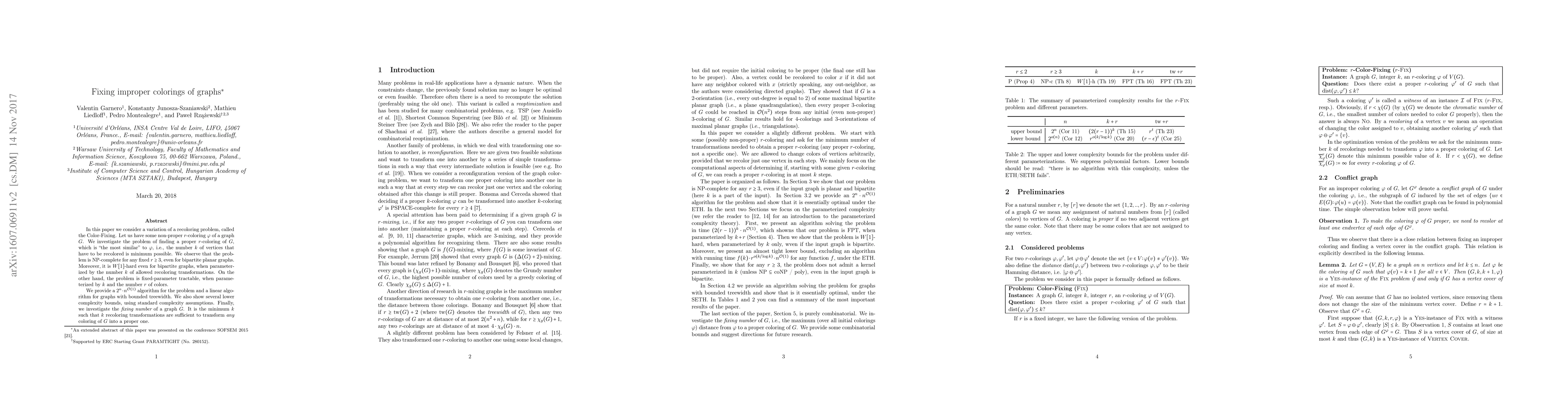 In this paper we consider a variation of a recoloring problem, called the Color-Fixing. Let us have some non-proper $r$-coloring $\varphi$ of a graph $G$. We investigate the problem of finding a proper $r$-coloring of $G$, which is "the most similar" to $\varphi$, i.e. the number $k$ of vertices that have to be recolored is minimum possible. We observe that the problem is NP-complete for any $r \geq 3$, even for bipartite planar graphs. On the other hand, the problem is fixed-parameter tractable, when parameterized by the number of allowed transformations $k$. We provide an $2^n \cdot n^{\mathcal{O}(1)}$ algorithm for the problem (for any fixed $r$) and a linear algorithm for graphs with bounded treewidth. We also show several lower complexity bounds, using standard complexity assumptions. Finally, we investigate the {\em fixing number} of a graph $G$. It is the maximum possible distance (in the number of transformations) between some non-proper coloring of $G$ and a proper one.