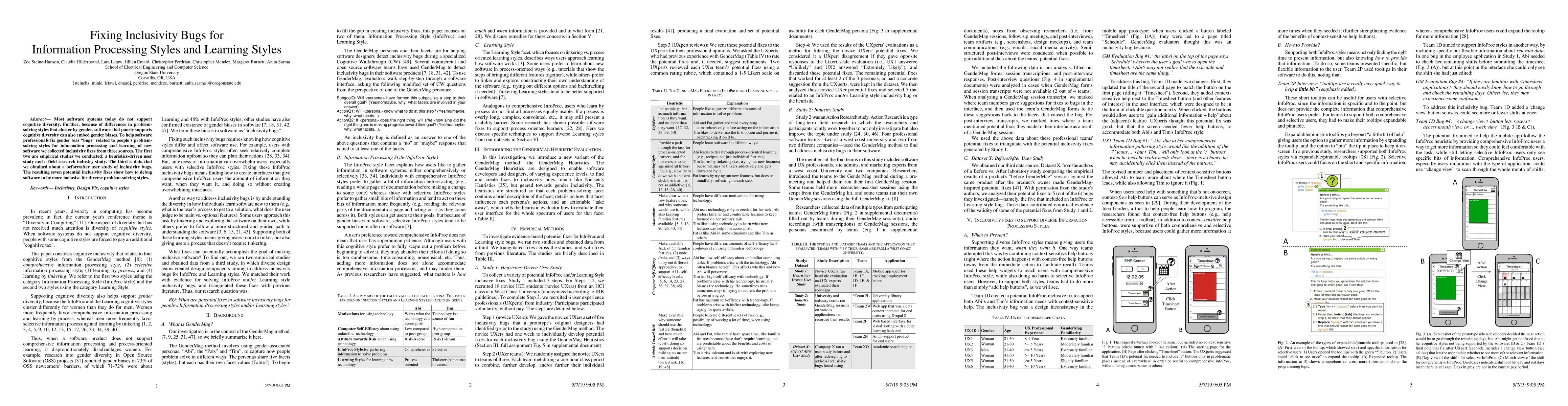 This paper identifies and proposes seven inclusivity fixes to address gender biases in software systems that fail to support cognitive diversity and varied problem-solving styles. The fixes are derived from empirical studies, including a heuristics-driven user study, a field research industry study, and data from a before/after user study of inclusivity bugs.
