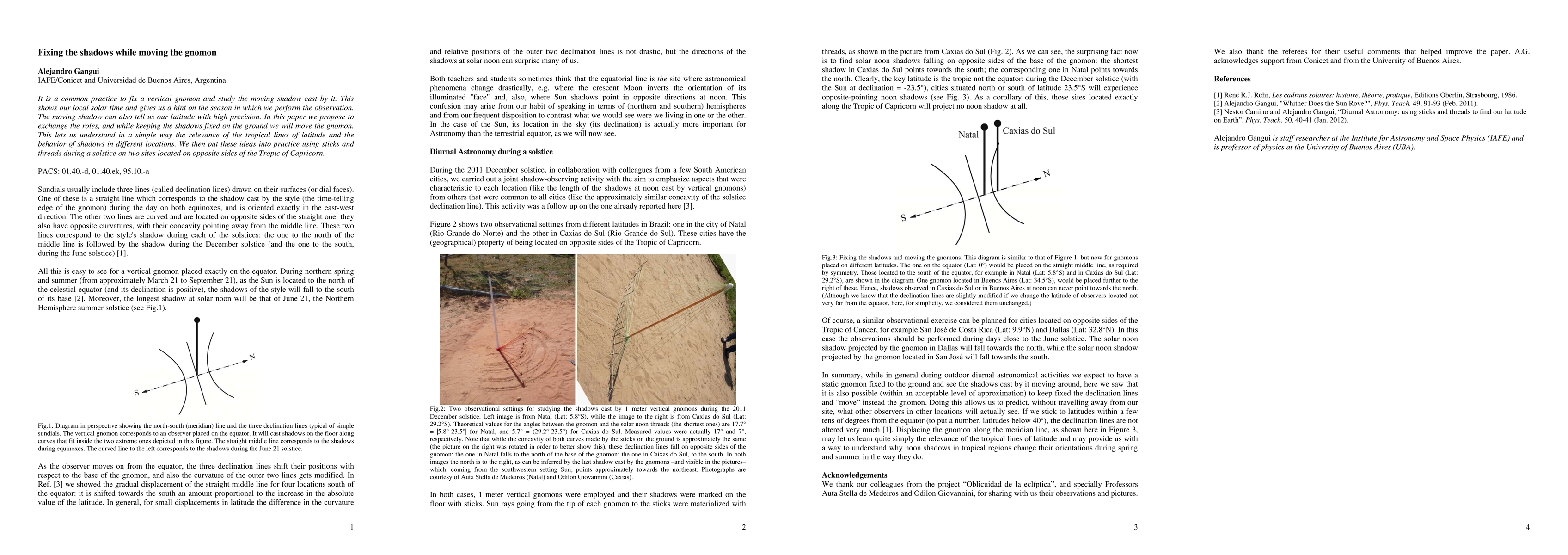 It is a common practice to fix a vertical gnomon and study the moving shadow cast by it. This shows our local solar time and gives us a hint regarding the season in which we perform the observation. The moving shadow can also tell us our latitude with high precision. In this paper we propose to exchange the roles and while keeping the shadows fixed on the ground we will move the gnomon. This lets us understand in a simple way the relevance of the tropical lines of latitude and the behavior of shadows in different locations. We then put these ideas into practice using sticks and threads during a solstice on two sites located on opposite sides of the Tropic of Capricorn.