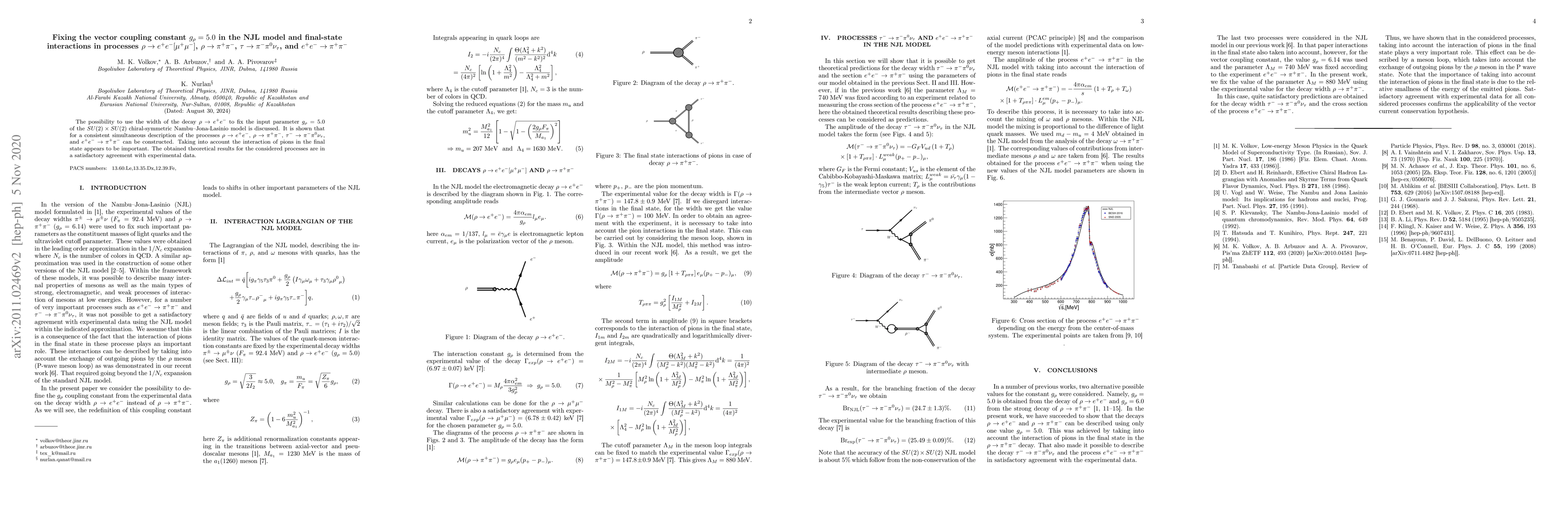This paper discusses fixing the vector coupling constant $g_\rho=5.0$ in the NJL model using the decay width of $\rho \to e^+e^-$. It demonstrates a consistent description of several decay processes, emphasizing the importance of final-state interactions, with theoretical results aligning well with experimental data.