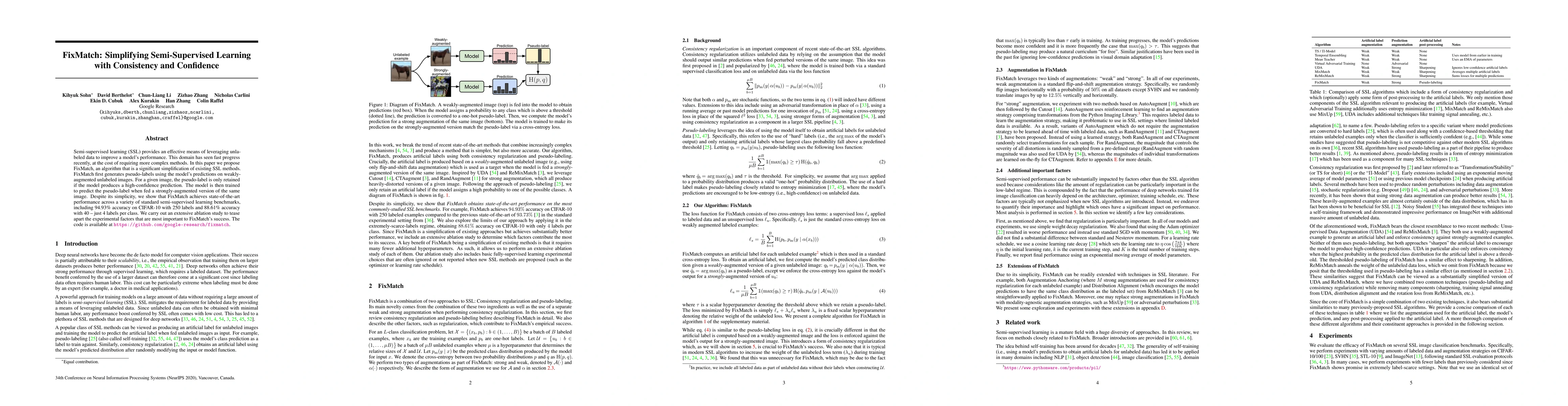 Semi-supervised learning (SSL) provides an effective means of leveraging unlabeled data to improve a model's performance. In this paper, we demonstrate the power of a simple combination of two common SSL methods: consistency regularization and pseudo-labeling. Our algorithm, FixMatch, first generates pseudo-labels using the model's predictions on weakly-augmented unlabeled images. For a given image, the pseudo-label is only retained if the model produces a high-confidence prediction. The model is then trained to predict the pseudo-label when fed a strongly-augmented version of the same image. Despite its simplicity, we show that FixMatch achieves state-of-the-art performance across a variety of standard semi-supervised learning benchmarks, including 94.93% accuracy on CIFAR-10 with 250 labels and 88.61% accuracy with 40 -- just 4 labels per class. Since FixMatch bears many similarities to existing SSL methods that achieve worse performance, we carry out an extensive ablation study to tease apart the experimental factors that are most important to FixMatch's success. We make our code available at https://github.com/google-research/fixmatch.