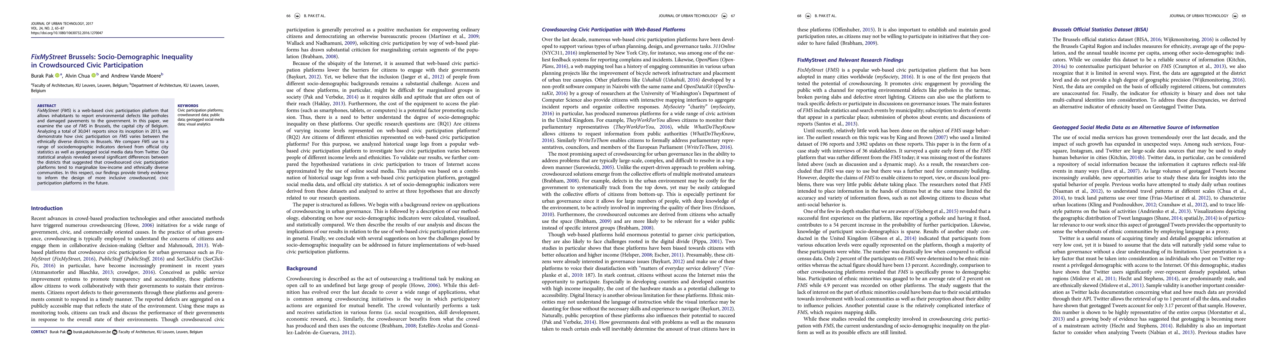 FixMyStreet (FMS) is a web-based civic participation platform that allows inhabitants to report environmental defects like potholes and damaged pavements to the government. In this paper, we examine the use of FMS in Brussels, the capital city of Belgium. Analyzing a total of 30,041 reports since its inception in 2013, we demonstrate how civic participation on FMS varies between the ethnically diverse districts in Brussels. We compare FMS use to a range of sociodemographic indicators derived from official city statistics as well as geotagged social media data from Twitter. Our statistical analysis revealed several significant differences between the districts that suggested that crowdsourced civic participation platforms tend to marginalize low-income and ethnically diverse communities. In this respect, our findings provide timely evidence to inform the design of more inclusive crowdsourced, civic participation platforms in the future.