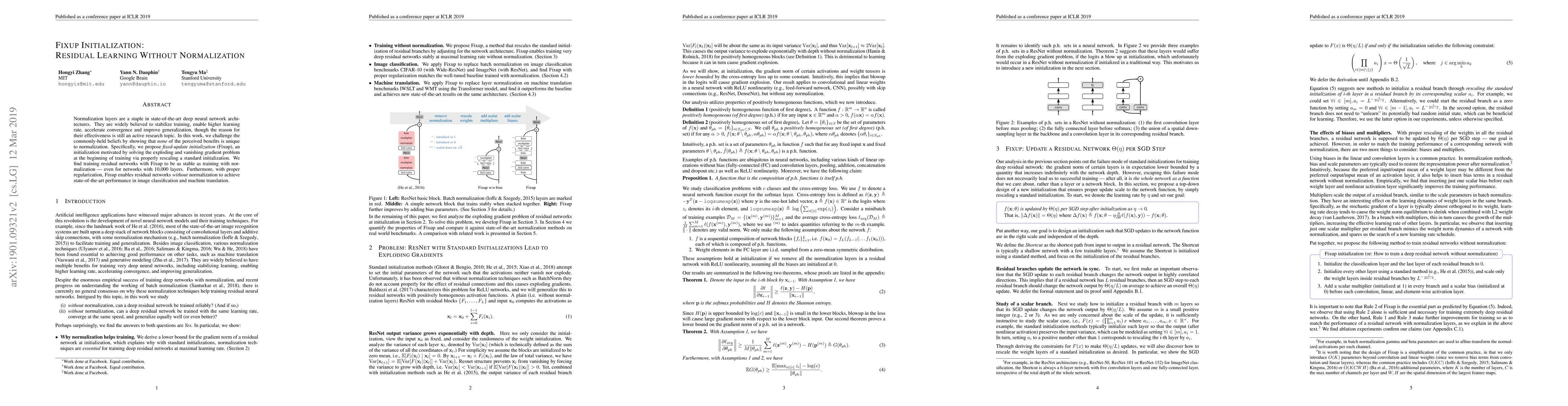 This paper proposes Fixup initialization, demonstrating that it can stabilize training and achieve state-of-the-art performance without using normalization layers, challenging the necessity of normalization in deep neural networks. Fixup addresses gradient issues at training start, showing comparable stability and performance to networks using normalization.