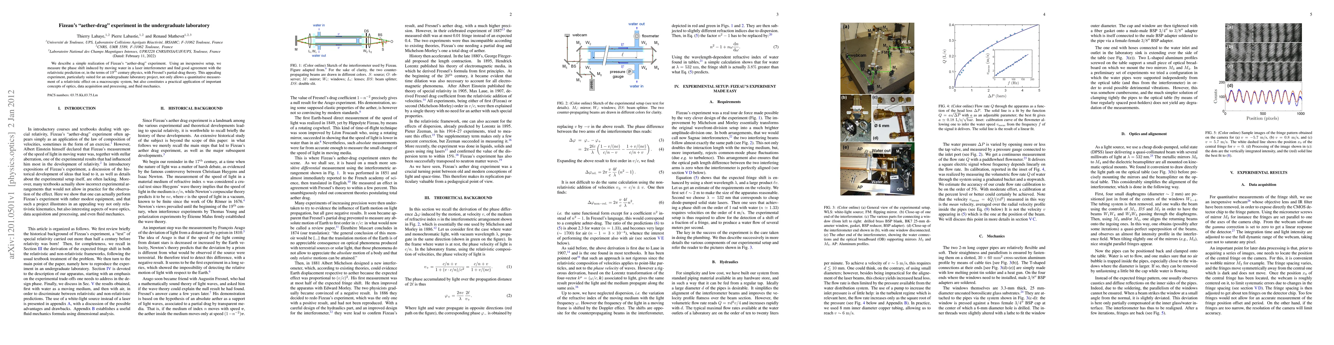This paper details a cost-effective undergraduate laboratory experiment replicating Fizeau's "aether-drag" experiment, measuring phase shifts from moving water in a laser interferometer, and confirming relativistic predictions or Fresnel's partial-drag theory, demonstrating key optics and fluid mechanics principles.