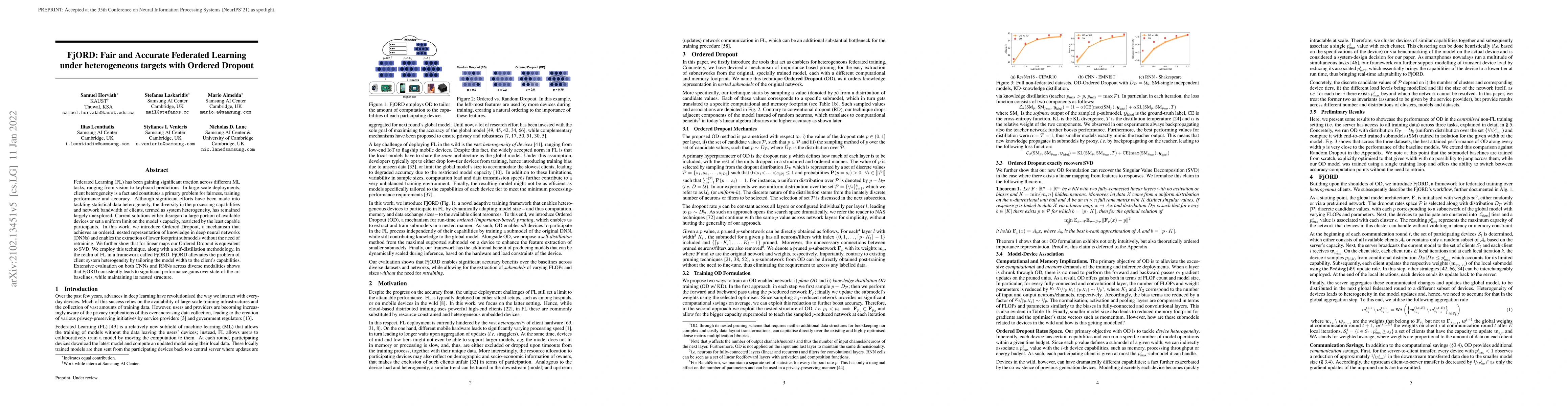 Federated Learning (FL) has been gaining significant traction across different ML tasks, ranging from vision to keyboard predictions. In large-scale deployments, client heterogeneity is a fact and constitutes a primary problem for fairness, training performance and accuracy. Although significant efforts have been made into tackling statistical data heterogeneity, the diversity in the processing capabilities and network bandwidth of clients, termed as system heterogeneity, has remained largely unexplored. Current solutions either disregard a large portion of available devices or set a uniform limit on the model's capacity, restricted by the least capable participants. In this work, we introduce Ordered Dropout, a mechanism that achieves an ordered, nested representation of knowledge in deep neural networks (DNNs) and enables the extraction of lower footprint submodels without the need of retraining. We further show that for linear maps our Ordered Dropout is equivalent to SVD. We employ this technique, along with a self-distillation methodology, in the realm of FL in a framework called FjORD. FjORD alleviates the problem of client system heterogeneity by tailoring the model width to the client's capabilities. Extensive evaluation on both CNNs and RNNs across diverse modalities shows that FjORD consistently leads to significant performance gains over state-of-the-art baselines, while maintaining its nested structure.