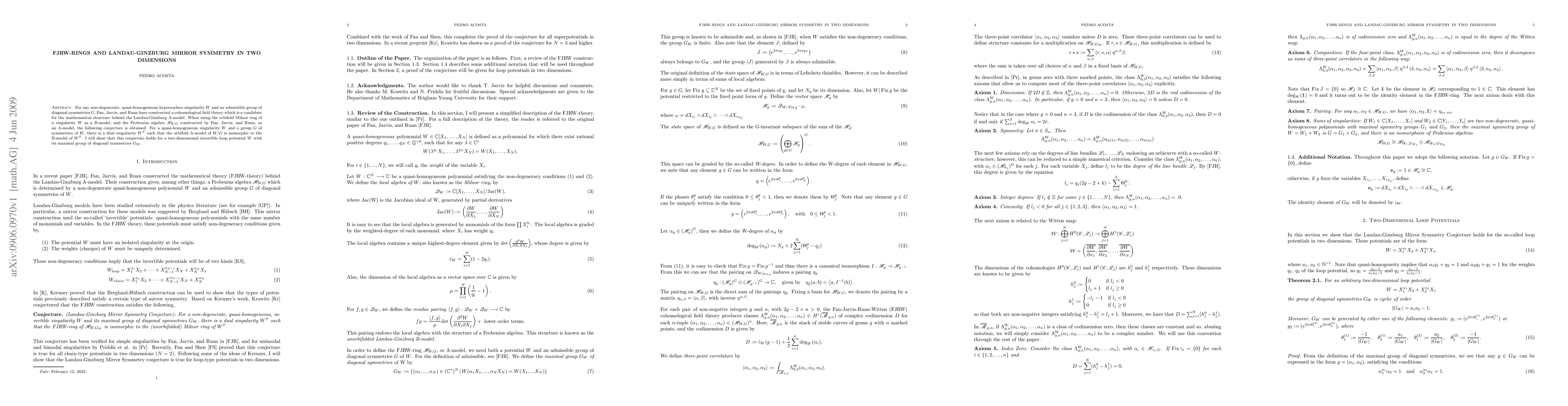 For any non-degenerate, quasi-homogeneous hypersurface singularity W and an admissible group of diagonal symmetries G, Fan, Jarvis, and Ruan have constructed a cohomological field theory which is a candidate for the mathematical structure behind the Landau-Ginzburg A-model. When using the orbifold Milnor ring of a singularity W as a B-model, and the Frobenius algebra H_{W,G} constructed by Fan, Jarvis, and Ruan, as an A-model, the following conjecture is obtained: For a quasi-homogeneous singularity W and a group G of symmetries of W, there is a dual singularity W^T such that the orbifold A-model of W/G is isomorphic to the B-model of W^T. I will show that this conjecture holds for a two-dimensional invertible loop potential $W$ with its maximal group of diagonal symmetries $G_{W}$.