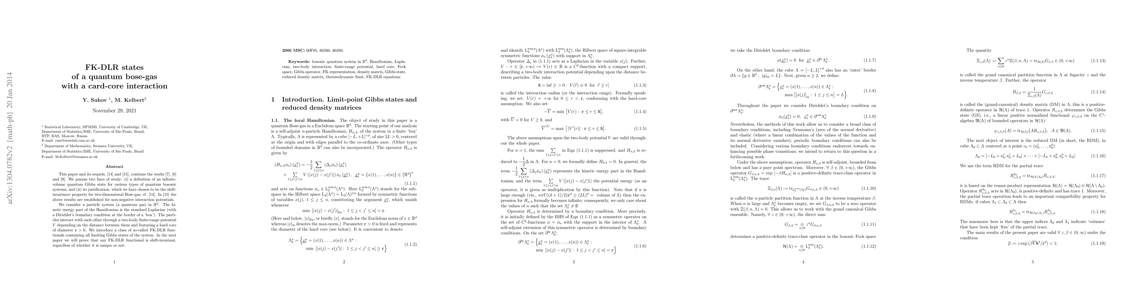 The paper focuses on infinite-volume bosonic states for a quantum particle system (a quantum gas) in a Euclidean space. The kinetic energy part of the Hamiltonian is the standard Laplacian (with a Dirichlet's boundary condition at the border of a `box'). The particles interact with each other through a two-body finite-range potential depending on the distance between them and featuring a hard core of a positive diameter. We introduce a class of so-called FK-DLR functionals containing all limiting Gibbs states of the system. In the next paper we will prove that any FK-DLR functional is shift-invariant, regardless of whether it is unique or not.