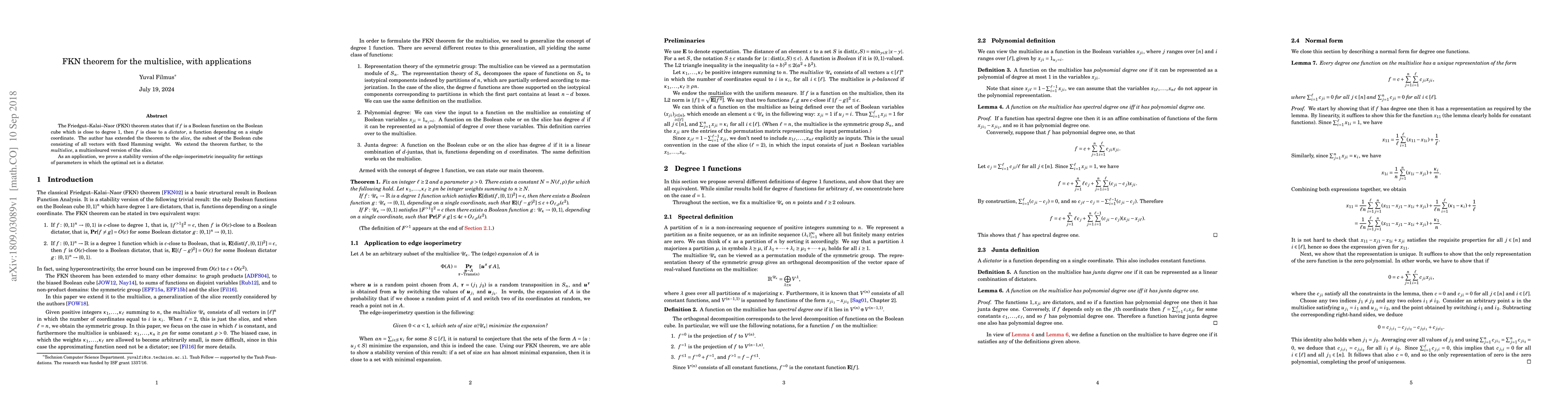 This paper extends the FKN theorem to the multislice, proving a stability version of an edge-isoperimetric inequality with applications in settings where optimal sets are dictator functions.