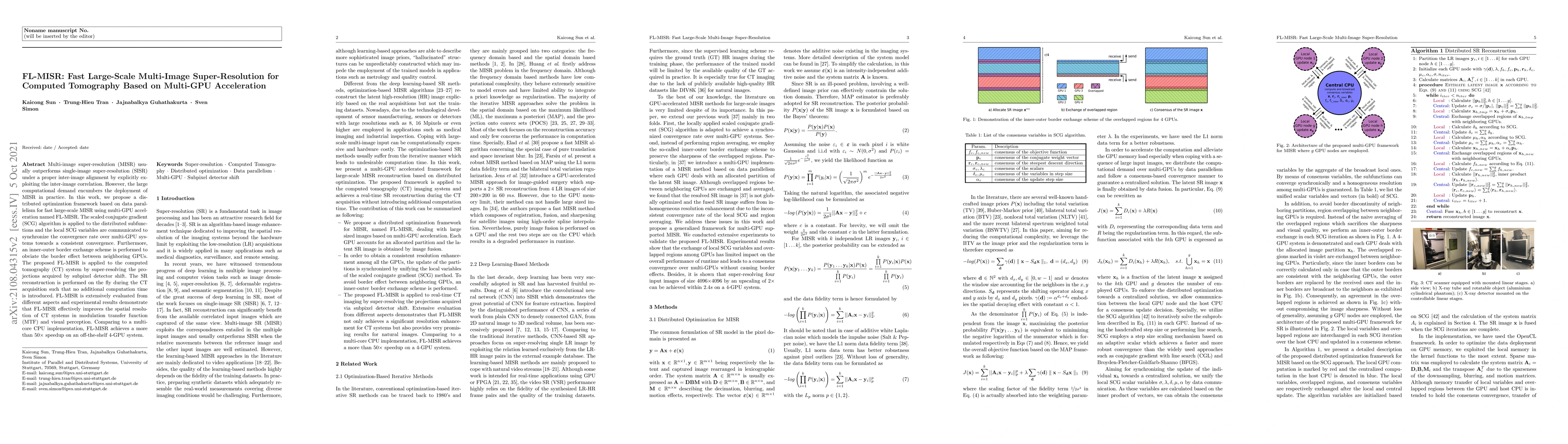 This paper proposes FL-MISR, a distributed optimization framework for fast large-scale multi-image super-resolution using multi-GPU acceleration, which significantly speeds up the process and improves the spatial resolution of computed tomography (CT) systems. The method achieves a more than 50x speedup compared to a multi-core CPU implementation.