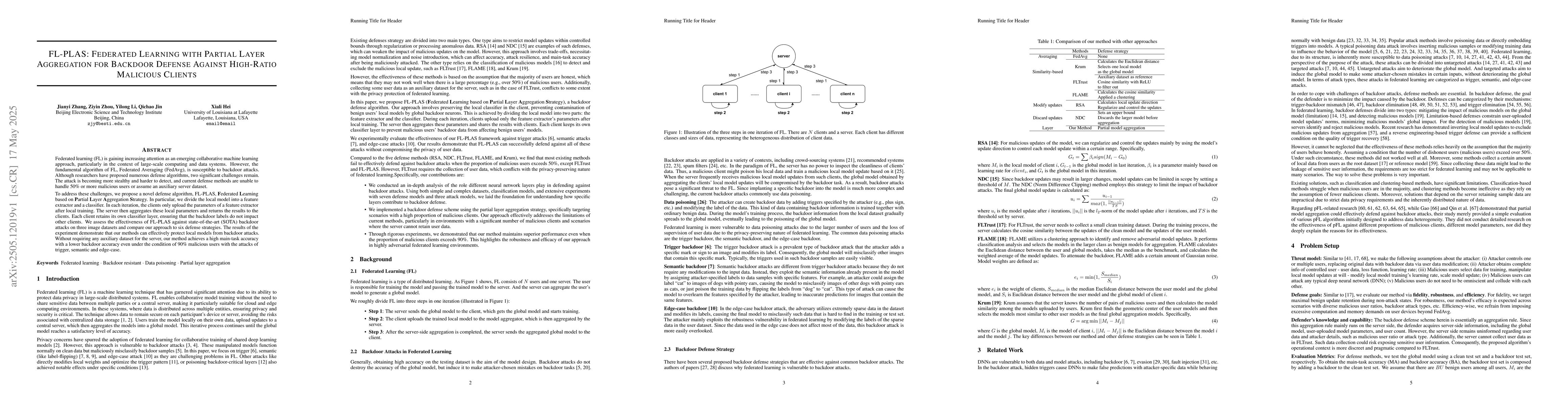 The research proposes FL-PLAS, a federated learning defense algorithm that uses partial layer aggregation. It divides the local model into a feature extractor and a classifier, with clients uploading only the feature extractor parameters. The server aggregates these and returns them to clients, each retaining its own classifier to prevent backdoor label impact.