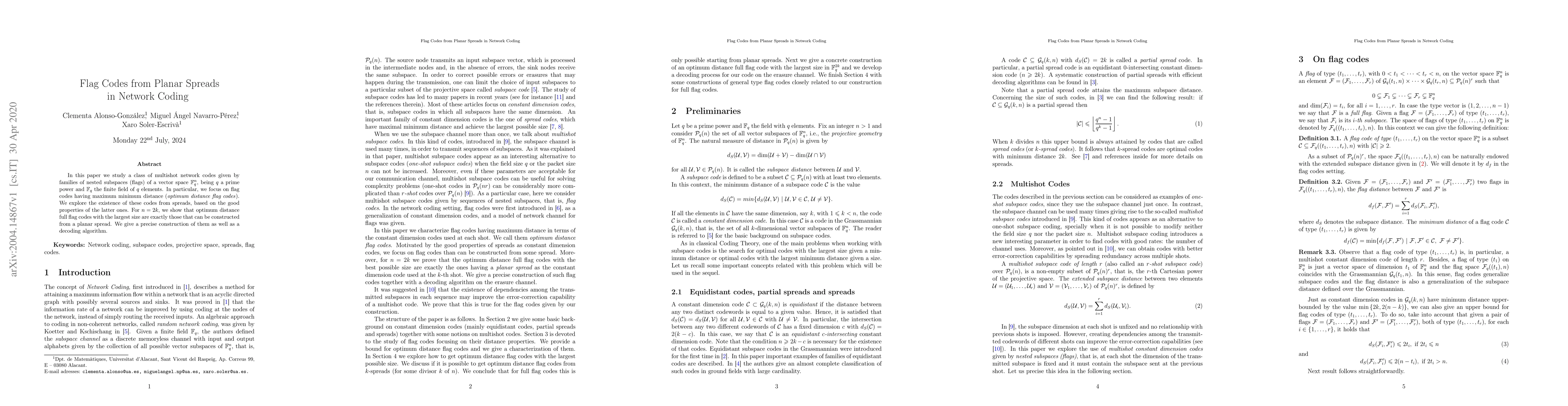 In this paper we study a class of multishot network codes given by families of nested subspaces (flags) of a vector space $\mathbb{F}_q^n$, being $q$ a prime power and $\mathbb{F}_q$ the finite field of $q$ elements. In particular, we focus on flag codes having maximum minimum distance (optimum distance flag codes). We explore the existence of these codes from spreads, based on the good properties of the latter ones. For $n=2k$, we show that optimum distance full flag codes with the largest size are exactly those that can be constructed from a planar spread. We give a precise construction of them as well as a decoding algorithm.
