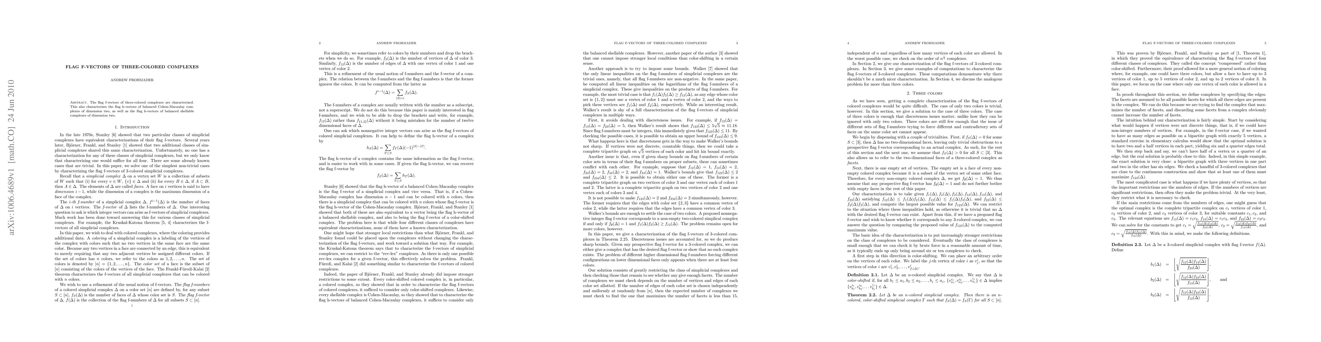 Summary: The paper characterizes the flag f-vectors of three-colored complexes, extending the results to flag h-vectors for balanced Cohen-Macaulay complexes and balanced shellable complexes in dimension two.