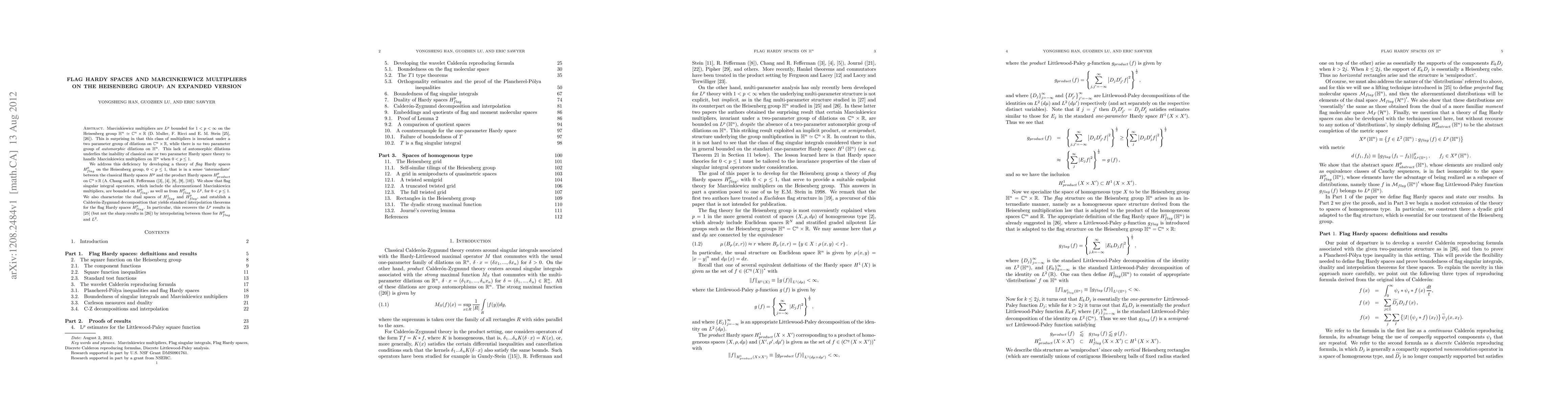 The paper develops a theory of flag Hardy spaces on the Heisenberg group to handle Marcinkiewicz multipliers, showing these operators are bounded on the new spaces and from these to L^p for 0<p≤1. It characterizes the dual spaces and establishes interpolation theorems for the flag Hardy spaces.