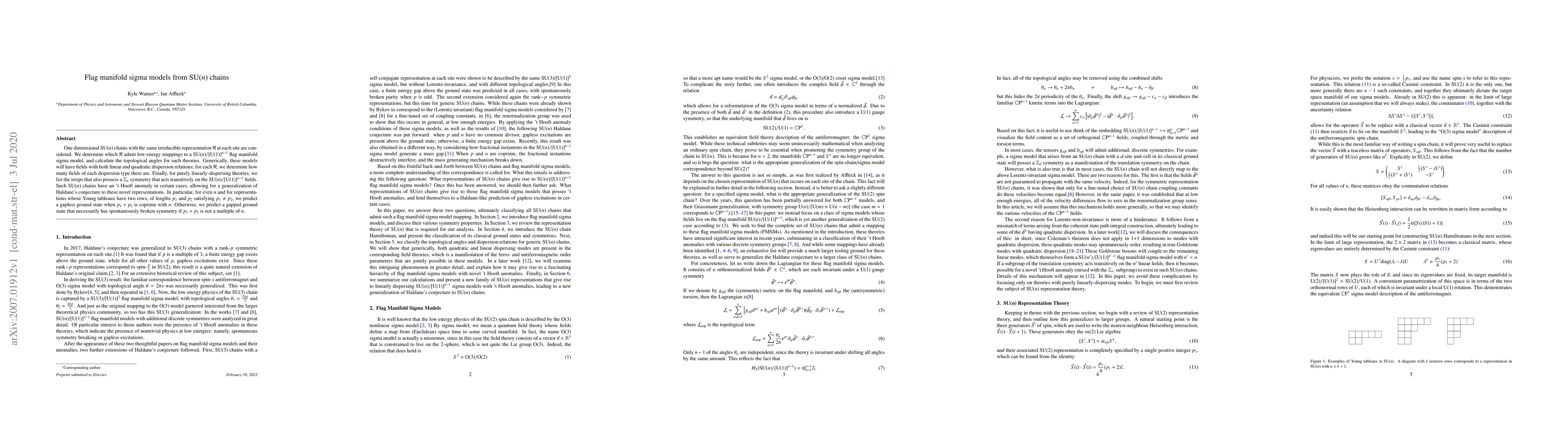 One dimensional SU($n$) chains with the same irreducible representation $\mathcal{R}$ at each site are considered. We determine which $\mathcal{R}$ admit low-energy mappings to a $\text{SU}(n)/[\text{U}(1)]^{n-1}$ flag manifold sigma model, and calculate the topological angles for such theories. Generically, these models will have fields with both linear and quadratic dispersion relations; for each $\mathcal{R}$, we determine how many fields of each dispersion type there are. Finally, for purely linearly-dispersing theories, we list the irreducible representations that also possess a $\mathbb{Z}_n$ symmetry that acts transitively on the $\text{SU}(n)/[\text{U}(1)]^{n-1}$ fields. Such SU($n$) chains have an 't Hooft anomaly in certain cases, allowing for a generalization of Haldane's conjecture to these novel representations. In particular, for even $n$ and for representations whose Young tableaux have two rows, of lengths $p_1$ and $p_2$ satisfying $p_1\not=p_2$, we predict a gapless ground state when $p_1+p_2$ is coprime with $n$. Otherwise, we predict a gapped ground state that necessarily has spontaneously broken symmetry if $p_1+p_2$ is not a multiple of $n$.