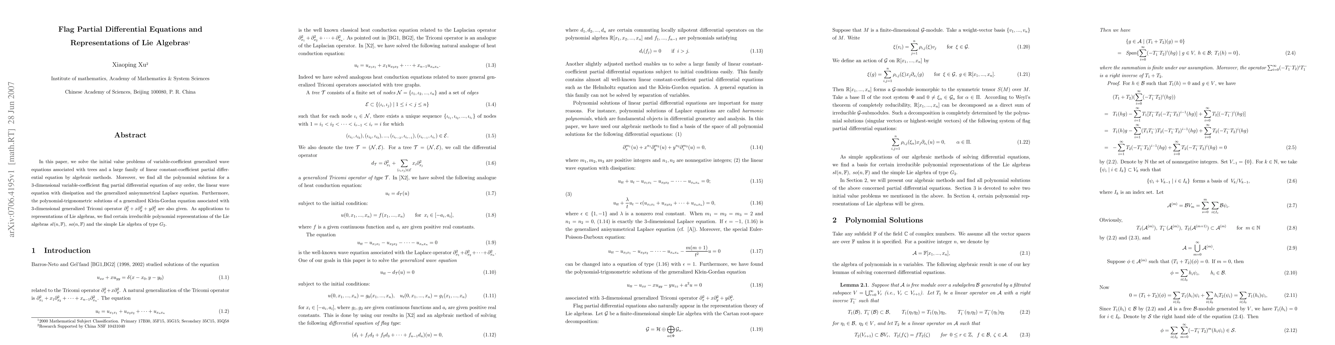 This paper solves initial value problems for generalized wave equations using algebraic methods, finding polynomial solutions for specific flag PDEs, and provides polynomial-trigonometric solutions for a generalized Klein-Gordan equation. It also explores irreducible polynomial representations of Lie algebras $sl(n,\mbb{F}), so(n,\mbb{F})$, and $G_2$.