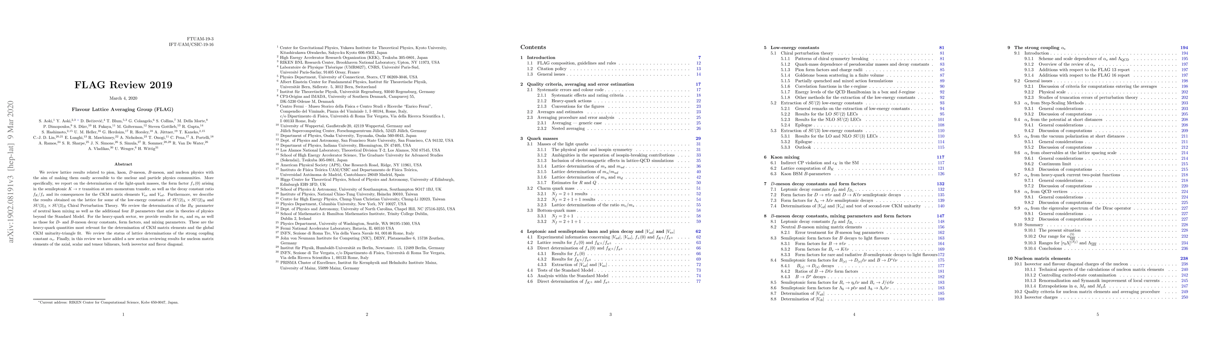 We review lattice results related to pion, kaon, $D$-meson, $B$-meson, and nucleon physics with the aim of making them easily accessible to the nuclear and particle physics communities. More specifically, we report on the determination of the light-quark masses, the form factor $f_+(0)$ arising in the semileptonic $K \to \pi$ transition at zero momentum transfer, as well as the decay constant ratio $f_K/f_\pi$ and its consequences for the CKM matrix elements $V_{us}$ and $V_{ud}$. Furthermore, we describe the results obtained on the lattice for some of the low-energy constants of $SU(2)_L\times SU(2)_R$ and $SU(3)_L\times SU(3)_R$ Chiral Perturbation Theory. We review the determination of the $B_K$ parameter of neutral kaon mixing as well as the additional four $B$ parameters that arise in theories of physics beyond the Standard Model. For the heavy-quark sector, we provide results for $m_c$ and $m_b$ as well as those for $D$- and $B$-meson decay constants, form factors, and mixing parameters. These are the heavy-quark quantities most relevant for the determination of CKM matrix elements and the global CKM unitarity-triangle fit. We review the status of lattice determinations of the strong coupling constant $\alpha_s$. Finally, in this review we have added a new section reviewing results for nucleon matrix elements of the axial, scalar and tensor bilinears, both isovector and flavor diagonal.