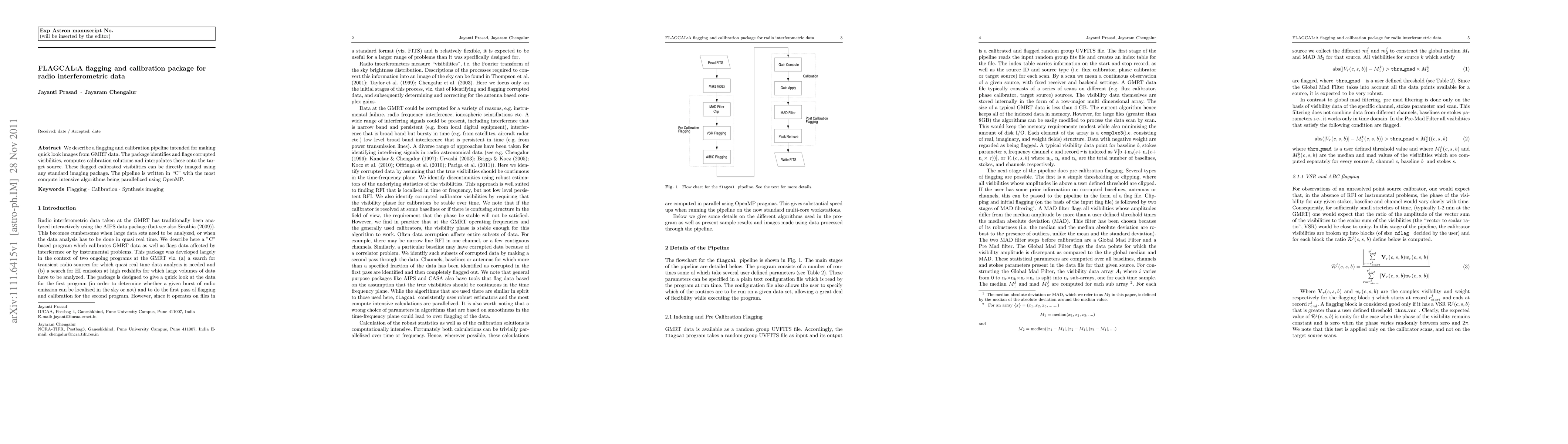 FLAGCAL is a C-based flagging and calibration pipeline for GMRT radio interferometric data, designed to quickly identify and flag corrupted visibilities, compute calibration solutions, and interpolate them for imaging. It utilizes OpenMP for parallelizing compute-intensive algorithms.