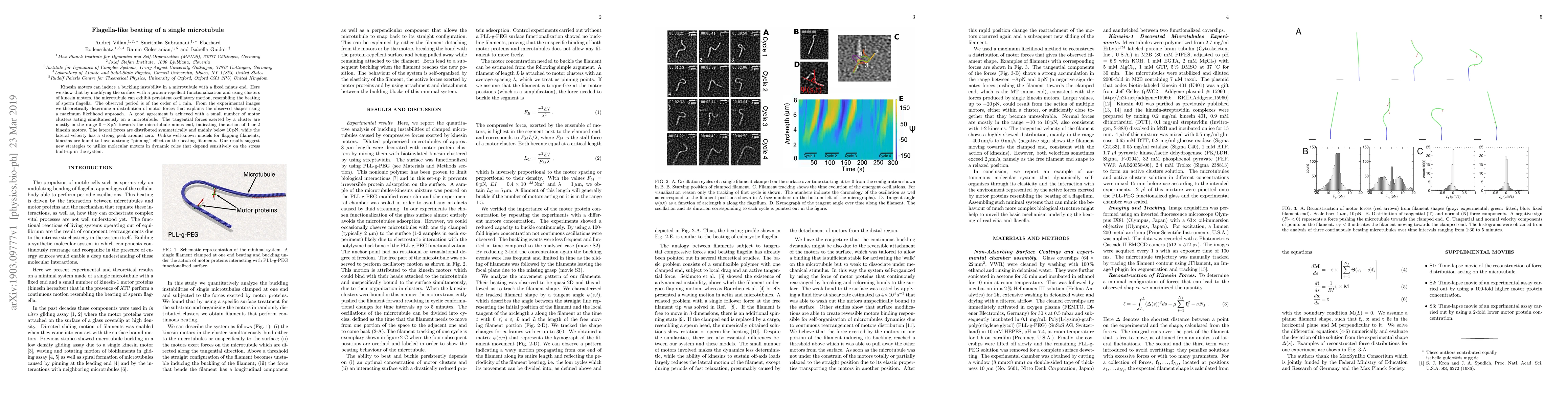 This paper demonstrates that a microtubule can exhibit flagella-like beating motion induced by clusters of kinesin motors, achieving persistent oscillatory motion akin to sperm flagella. Theoretical analysis reveals that a small number of motor clusters generate tangential forces in the range of 0-8 pN, highlighting the potential for utilizing molecular motors in dynamic, stress-dependent applications.
