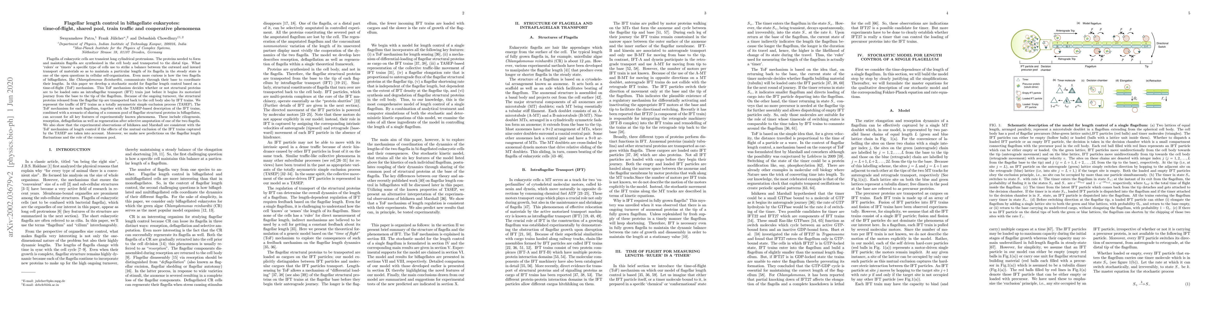 This paper develops a stochastic model for flagellar length control in biflagellate eukaryotes, proposing a time-of-flight mechanism that regulates the loading of structural proteins onto intraflagellar transport trains. The model, incorporating a shared pool of proteins and a totally asymmetric simple exclusion process, explains key phenomena like ciliogenesis and regeneration, and predicts new aspects of flagellar length dynamics.
