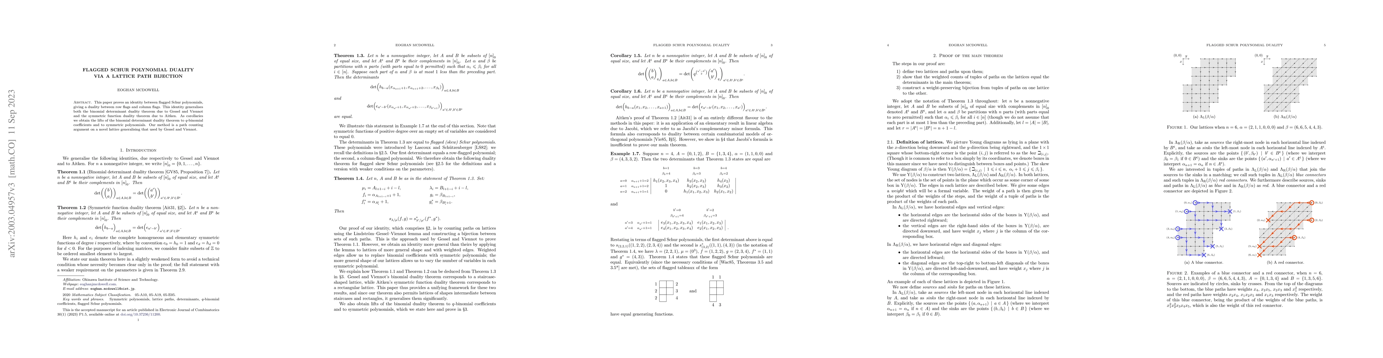 This paper proves an identity between flagged Schur polynomials, giving a duality between row flags and column flags. This identity generalises both the binomial determinant duality theorem due to Gessel and Viennot and the symmetric function duality theorem due to Aitken. As corollaries we obtain the lifts of the binomial determinant duality theorem to $q$-binomial coefficients and to symmetric polynomials. Our method is a path counting argument on a novel lattice generalising that used by Gessel and Viennot.