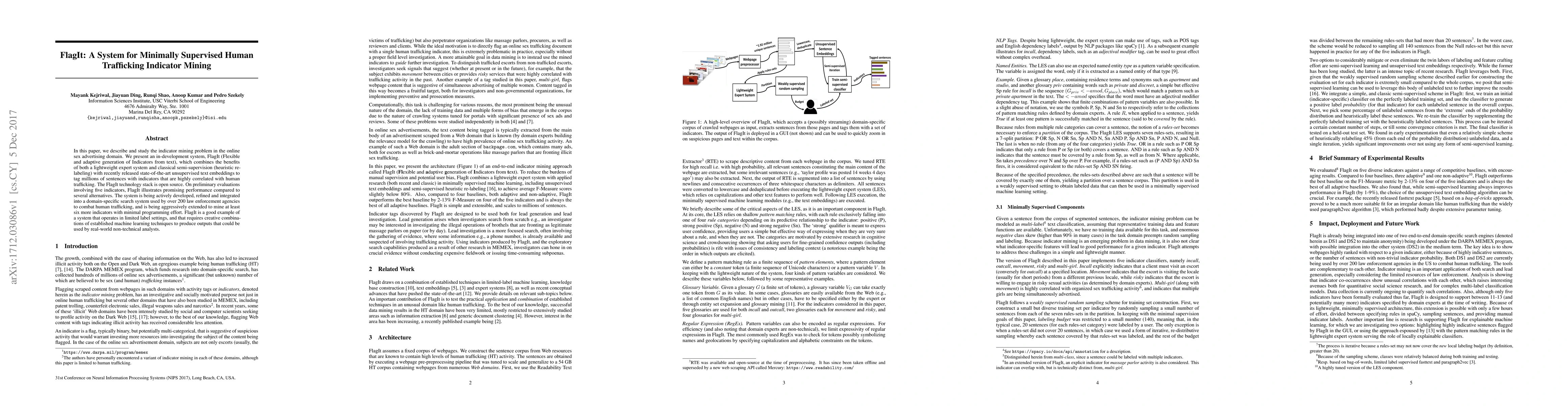 In this paper, we describe and study the indicator mining problem in the online sex advertising domain. We present an in-development system, FlagIt (Flexible and adaptive generation of Indicators from text), which combines the benefits of both a lightweight expert system and classical semi-supervision (heuristic re-labeling) with recently released state-of-the-art unsupervised text embeddings to tag millions of sentences with indicators that are highly correlated with human trafficking. The FlagIt technology stack is open source. On preliminary evaluations involving five indicators, FlagIt illustrates promising performance compared to several alternatives. The system is being actively developed, refined and integrated into a domain-specific search system used by over 200 law enforcement agencies to combat human trafficking, and is being aggressively extended to mine at least six more indicators with minimal programming effort. FlagIt is a good example of a system that operates in limited label settings, and that requires creative combinations of established machine learning techniques to produce outputs that could be used by real-world non-technical analysts.