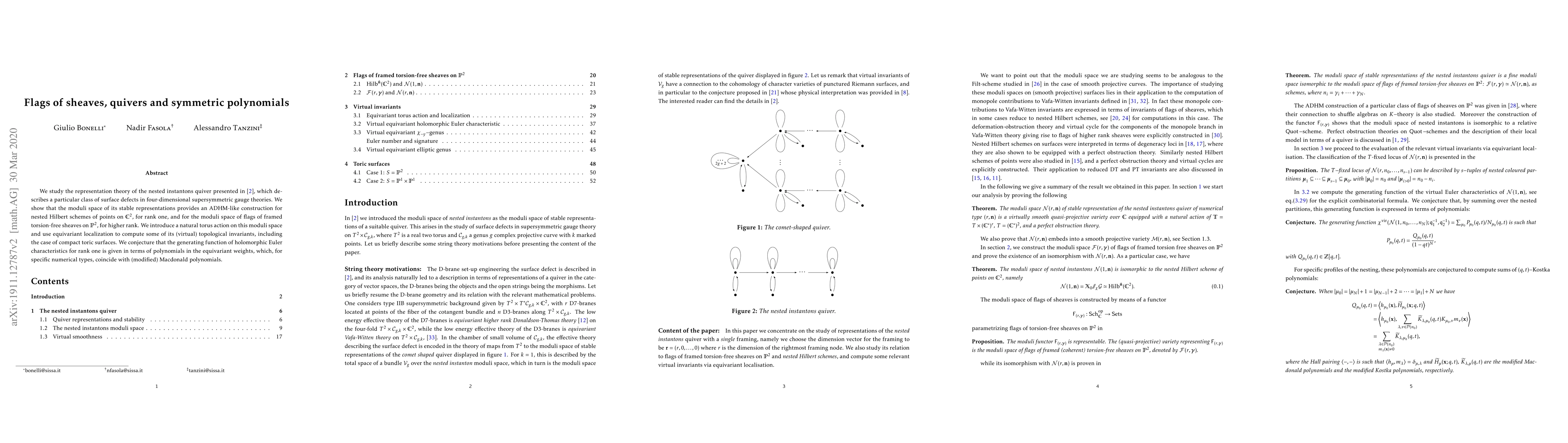 We study the representation theory of the nested instantons quiver presented in [1], which describes a particular class of surface defects in four-dimensional supersymmetric gauge theories. We show that the moduli space of its stable representations provides an ADHM-like construction for nested Hilbert schemes of points on $\mathbb C^2$, for rank one, and for the moduli space of flags of framed torsion-free sheaves on $\mathbb P^2$, for higher rank. We introduce a natural torus action on this moduli space and use equivariant localization to compute some of its (virtual) topological invariants, including the case of compact toric surfaces. We conjecture that the generating function of holomorphic Euler characteristics for rank one is given in terms of polynomials in the equivariant weights, which, for specific numerical types, coincide with (modified) Macdonald polynomials.