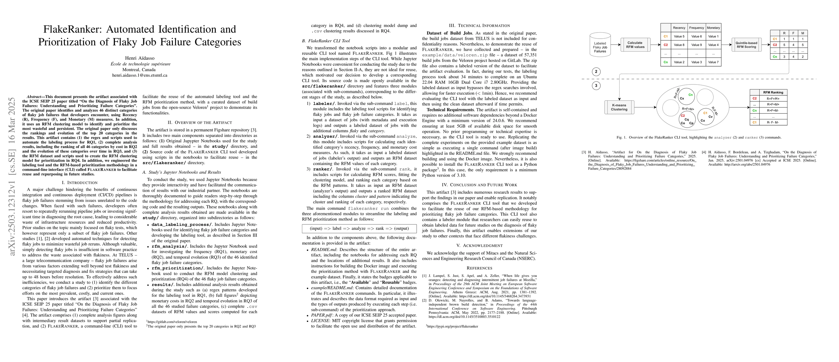 This paper presents the artifact for diagnosing flaky job failures, including scripts and datasets for automating the identification and prioritizing of 46 failure categories using RFM measures and clustering. The tool, FLAKERANKER, facilitates reuse and analysis of failure categories over time.