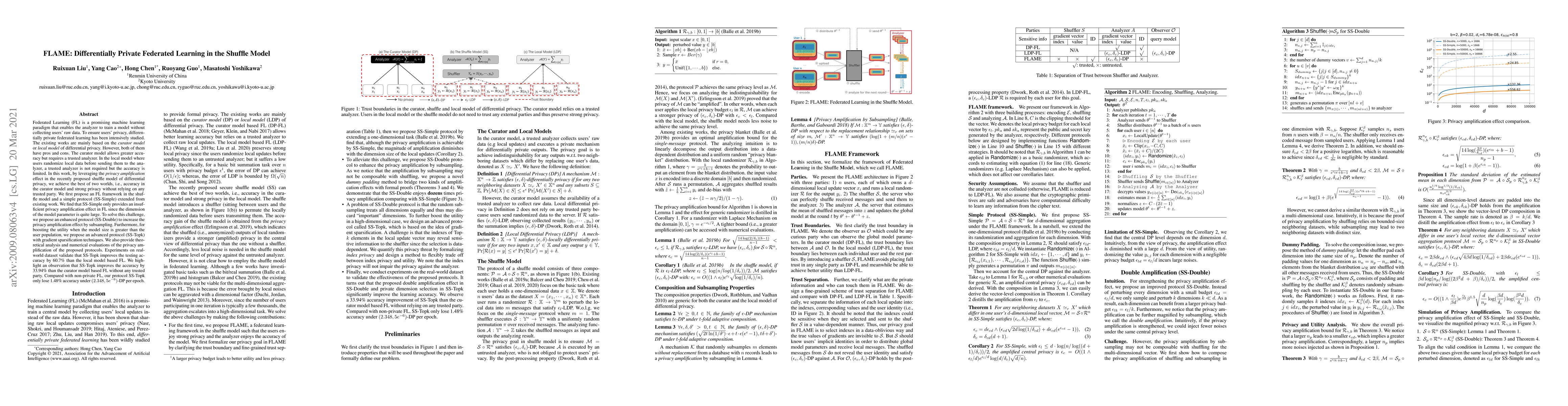 This paper proposes differentially private federated learning in the shuffle model, aiming to achieve high accuracy and strong privacy without a trusted central party. The authors introduce three protocols: SS-Simple, SS-Double, and SS-Topk, with SS-Topk utilizing gradient sparsification to enhance utility. Experiments show SS-Topk improves testing accuracy by 60.7% compared to the local model.