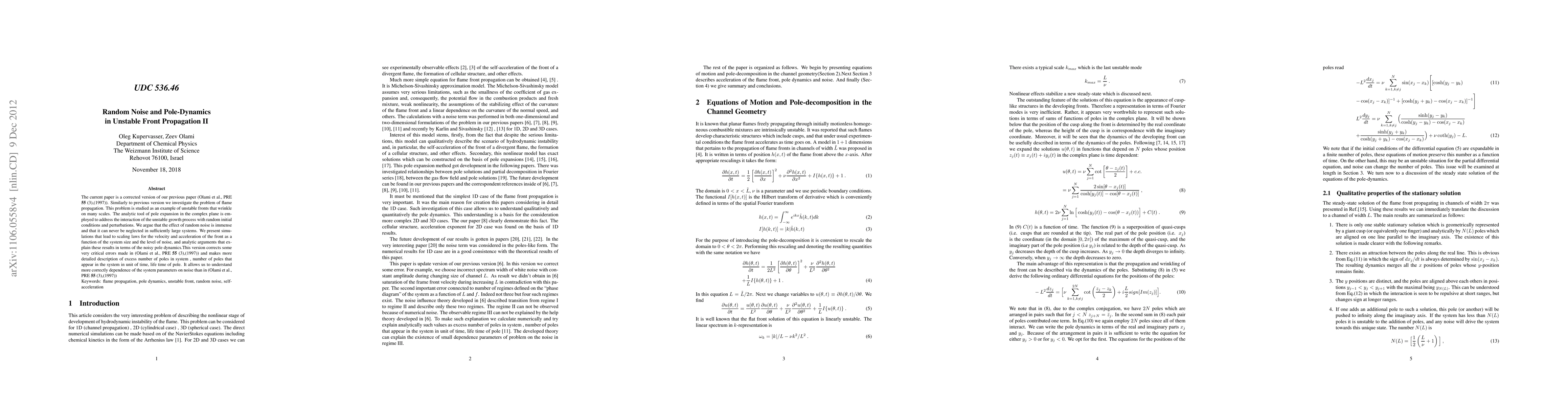 The paper presents a detailed analysis of flame front propagation under random noise using pole dynamics, correcting errors from a previous version and providing more precise descriptions of pole behavior.