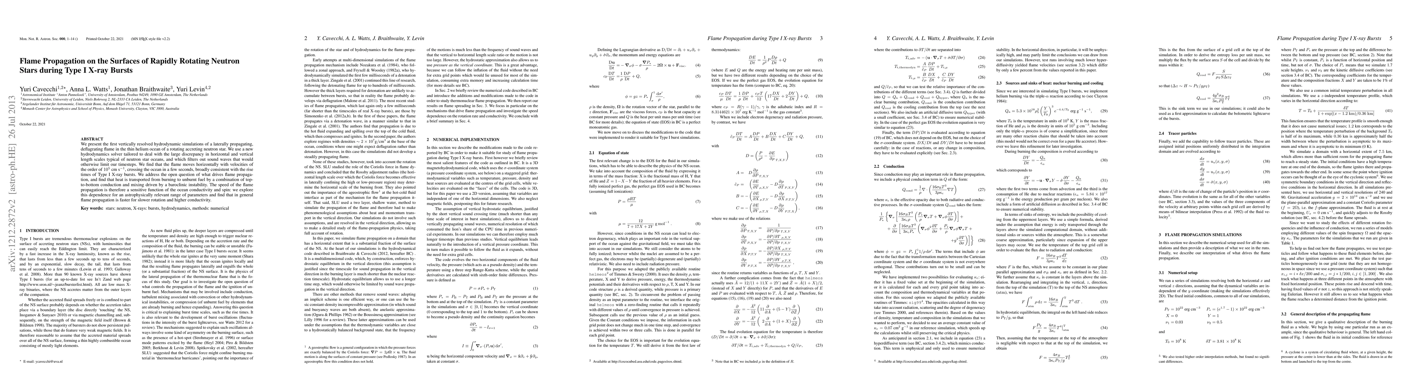 Researchers simulate flame propagation on neutron star surfaces during Type I X-ray bursts, finding that flames move at speeds of 10^5 cm/s due to a combination of conduction and mixing driven by baroclinic instability, with speed depending on ocean conductivity and spin.