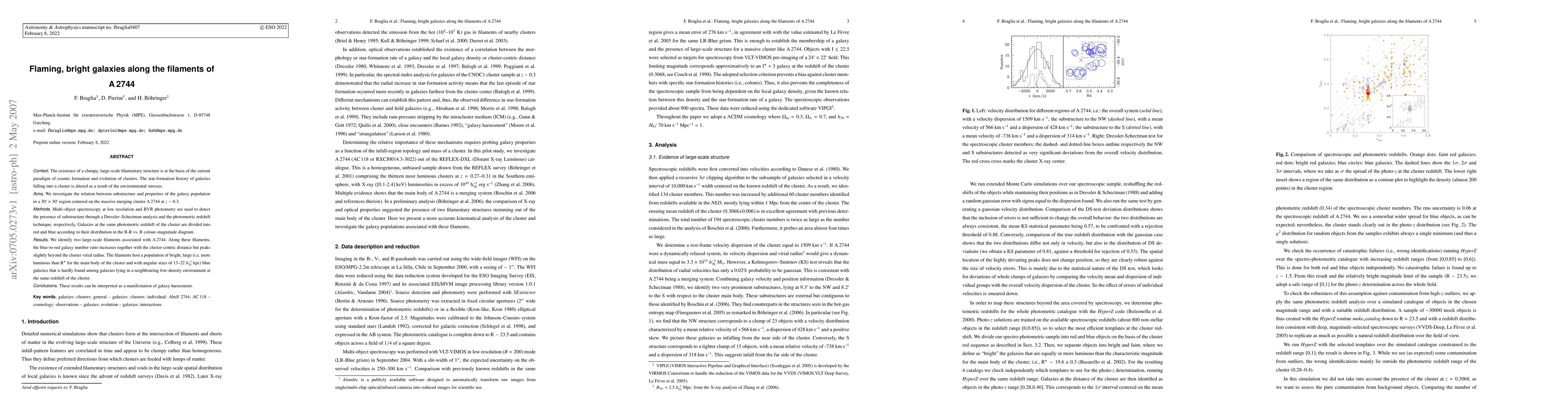 The existence of a clumpy, large-scale filamentary structure is at the basis of the current paradigm of cosmic formation and evolution of clusters. The star-formation history of galaxies falling into a cluster is altered as a result of the environmental stresses. We investigate the relation between substructure and properties of the galaxy population in a 30'x30' region centered on the massive merging cluster A2744 at z~0.3. Multi-object spectroscopy at low resolution and BVR photometry are used to detect the presence of substructure through a Dressler-Schectman analysis and the photometric redshift technique, respectively. Galaxies at the same photometric redshift of the cluster are divided into red and blue according to their distribution in the B-R vs. R colour-magnitude diagram. We identify two large-scale filaments associated with A2744. Along these filaments, the blue-to-red galaxy number ratio increases together with the cluster-centric distance but peaks slightly beyond the cluster virial radius. The filaments host a population of bright, large (i.e. more luminous than R* for the main body of the cluster and with angular sizes of 13-22 $h_{70}^{-1}$ kpc) blue galaxies that is hardly found among galaxies lying in a neighbouring low-density environment at the same redshift of the cluster. These results can be interpreted as a manifestation of galaxy harassment.