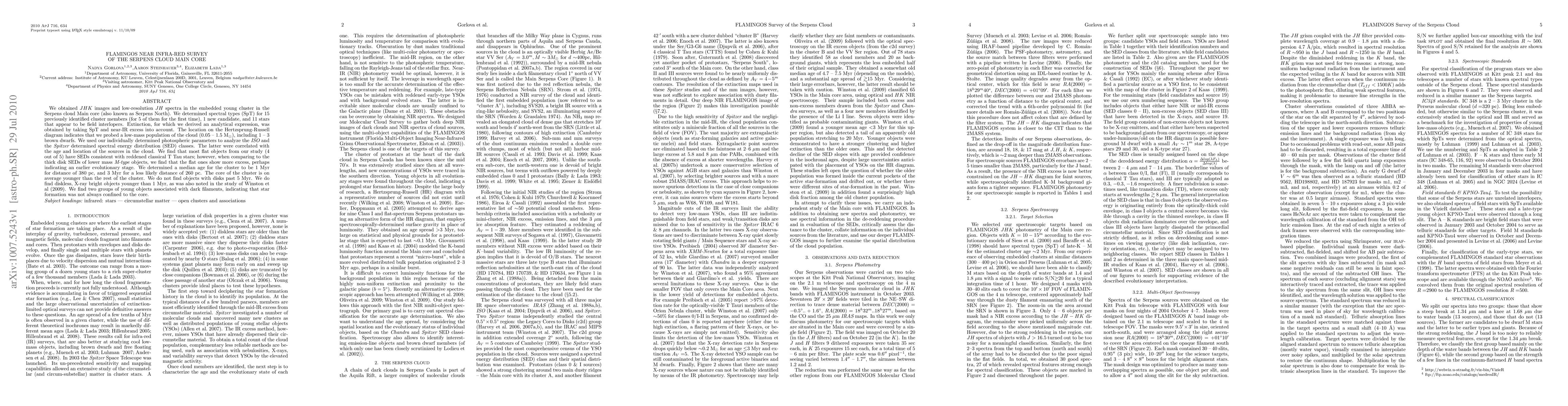 We obtained JHK images and low-resolution JH spectra in the embedded young cluster in the Serpens cloud Main core (also known as Serpens North). We determined spectral types for 15 previously identified cluster members (for 5 of them for the first time), 1 new candidate, and 11 stars that appear to be field interlopers. Extinction, for which we derived an analytical expression, was obtained by taking SpT and near-IR excess into account. The location on the Hertzsprung-Russell diagram indicates that we probed a low-mass population of the cloud (0.05 - 1.5 Msol), including 1 - 3 brown dwarfs. We used our individually determined photospheric parameters to analyze the ISO and the Spitzer determined spectral energy distribution classes. The latter were correlated with the age and location of the sources in the cloud. We find that most flat objects from our study (4 out of 5) have SEDs consistent with reddened classical T Tau stars; however, when comparing to the thick disk SEDs of lower mass M-type objects, we find that the flat ones show more excess, perhaps indicating an earlier evolutionary stage. We determined a median age for the cluster to be 1 Myr for distance of 380 pc, and 3 Myr for a less likely distance of 260 pc. The core of the cluster is on average younger than the rest of the cluster. We do not find objects with disks past 5 Myr. We do find diskless, X-ray bright objects younger than 1 Myr, as was also noted in the study of Winston et al (2009). We find two groups of young objects associated with dark filaments, indicating that star formation was not always confined to the core.