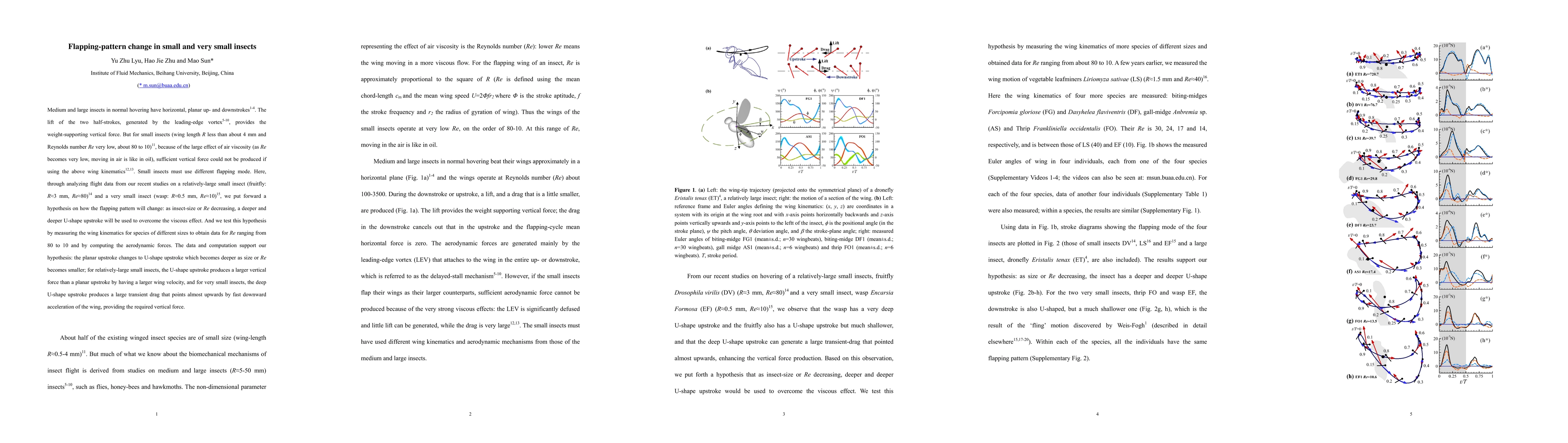 Medium and large insects in normal hovering have horizontal, planar up- and downstrokes1-4. The lift of the two half-strokes, generated by the leading-edge vortex, provides the weight-supporting vertical force. But for small insects (wing length R less than about 4 mm and Reynolds number Re very low, about 80 to 10), because of the large effect of air viscosity (as Re becomes very low, moving in air is like in oil), sufficient vertical force could not be produced if using the above wing kinematics. Small insects must use different flapping mode. Here, through analyzing flight data from our recent studies on a relatively-large small insect (fruitfly: R=3 mm, Re=80) and a very small insect (wasp: R=0.5 mm, Re=10), we put forward a hypothesis on how the flapping pattern will change: as insect-size or Re decreasing, a deeper and deeper U-shape upstroke will be used to overcome the viscous effect. And we test this hypothesis by measuring the wing kinematics for species of different sizes to obtain data for Re ranging from 80 to 10 and by computing the aerodynamic forces. The data and computation support our hypothesis: the planar upstroke changes to U-shape upstroke which becomes deeper as size or Re becomes smaller; for relatively-large small insects, the U-shape upstroke produces a larger vertical force than a planar upstroke by having a larger wing velocity, and for very small insects, the deep U-shape upstroke produces a large transient drag that points almost upwards by fast downward acceleration of the wing, providing the required vertical force.