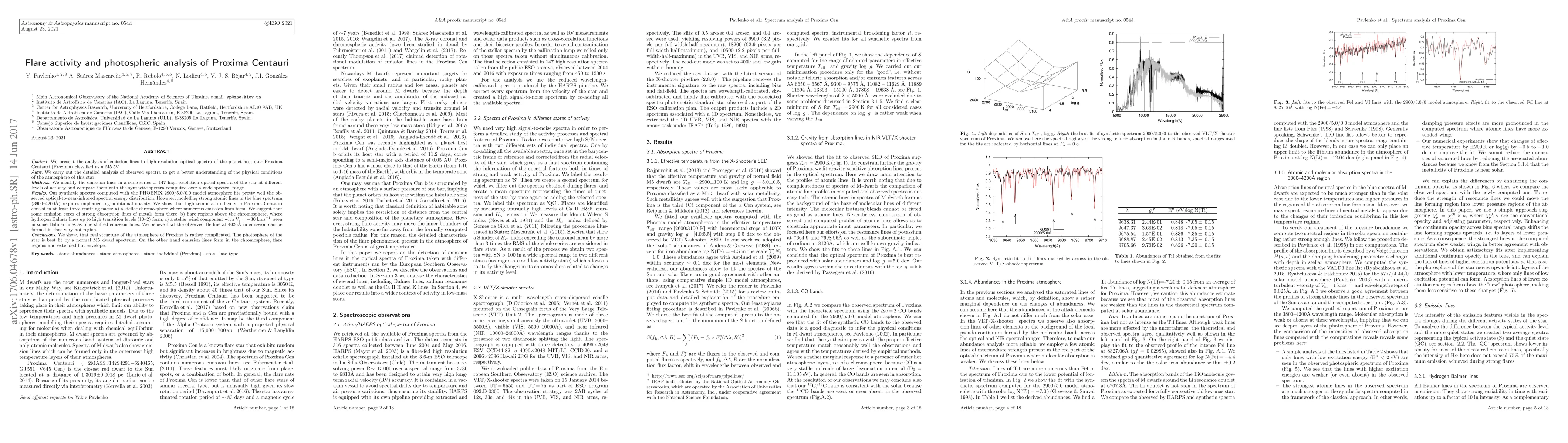 We present the analysis of emission lines in high-resolution optical spectra of the planet-host star Proxima Centauri (Proxima) classified as a M5.5V\@. We carry out the detailed analysis of observed spectra to get a better understanding of the physical conditions of the atmosphere of this star. We identify the emission lines in a serie series of 147 high-resolution optical spectra of the star at different levels of activity and compare them with the synthetic spectra computed over a wide spectral range. Our synthetic spectra computed with the PHOENIX 2900/5.0/0.0 model atmosphere fits pretty well the observed optical-to-near-infrared spectral energy distribution. However, modelling strong atomic lines in the blue spectrum (3900--4200\AA{}) requires implementing additional opacity. We show that high temperature layers in Proxima Centauri consist in at least three emitting parts: a) a stellar chromosphere where numerous emission lines form. We suggest that some emission cores of strong absorption lines of metals form there; b) flare regions above the chromosphere, where hydrogen Balmer lines up to high transition levels (10--2) form; c) a stellar wind component with V${r}$\,=\,$-$30 \kmps{} seen in some Balmer lines as blue shifted emission lines. We believe that the observed He line at 4026\AA{} in emission can be formed in that very hot region. We show, that real structure of the atmosphere of Proxima is rather complicated. The photosphere of the star is best fit by a normal M5 dwarf spectrum. On the other hand emission lines form in the chromosphere, flare regions and extended hot envelope.