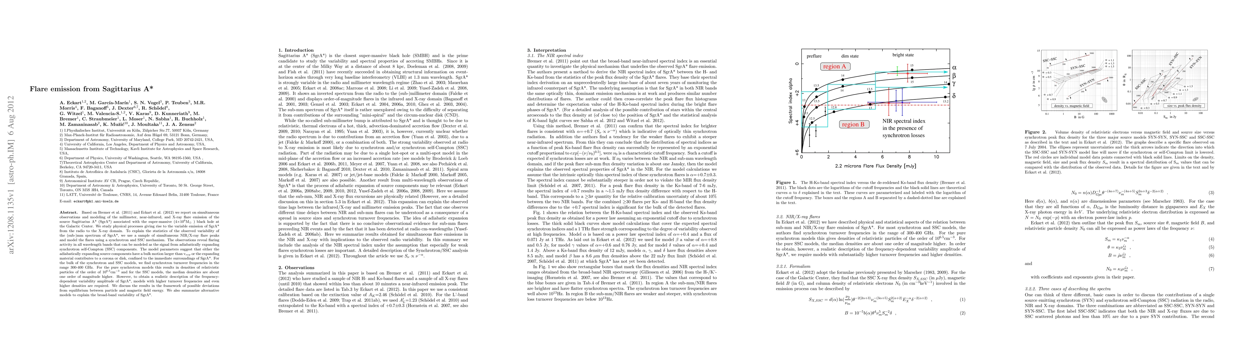 This paper reports on simultaneous observations of the flare emission from Sagittarius A* (SgrA*), the supermassive black hole at the Galactic Center, across millimeter, near-infrared, and X-ray wavelengths. The study models the flares using a synchrotron and synchrotron self-Compton mechanism, suggesting high densities of relativistic particles and the presence of adiabatically expanding components.