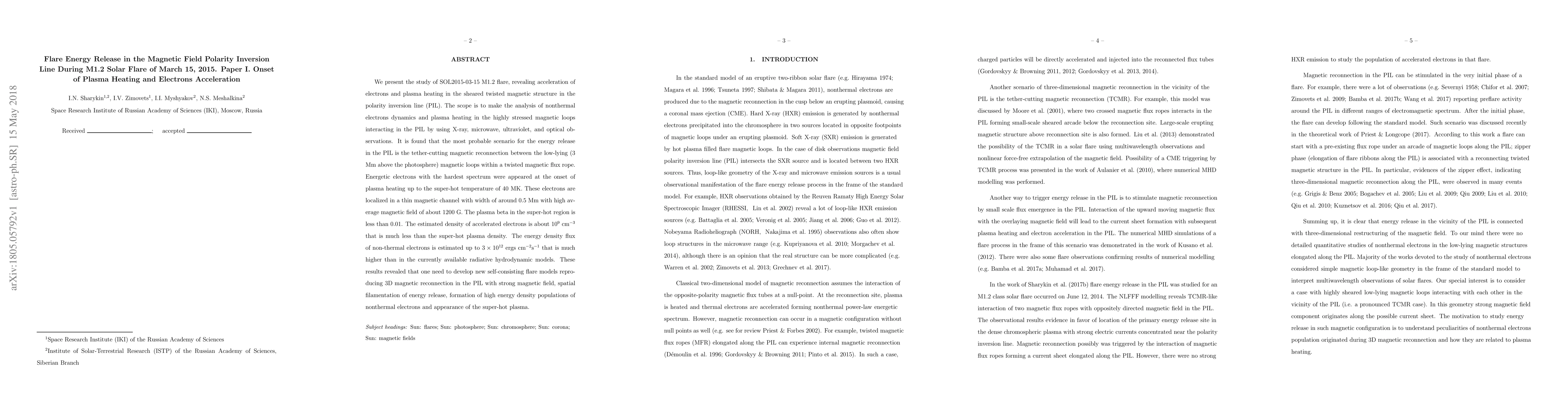 This study investigates the M1.2 solar flare on March 15, 2015, focusing on electron acceleration and plasma heating in the polarity inversion line. The findings suggest that tether-cutting magnetic reconnection in twisted magnetic loops leads to the formation of super-hot plasma and high-energy electron populations, necessitating new flare models.