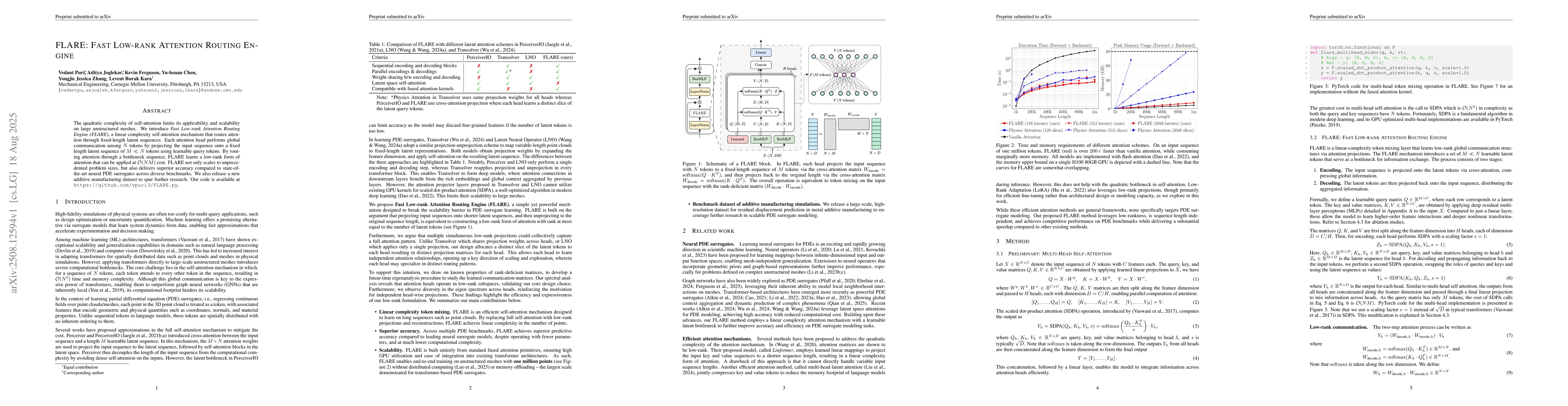 The quadratic complexity of self-attention limits its applicability and scalability on large unstructured meshes. We introduce Fast Low-rank Attention Routing Engine (FLARE), a linear complexity self-attention mechanism that routes attention through fixed-length latent sequences. Each attention head performs global communication among $N$ tokens by projecting the input sequence onto a fixed length latent sequence of $M \ll N$ tokens using learnable query tokens. By routing attention through a bottleneck sequence, FLARE learns a low-rank form of attention that can be applied at $O(NM)$ cost. FLARE not only scales to unprecedented problem sizes, but also delivers superior accuracy compared to state-of-the-art neural PDE surrogates across diverse benchmarks. We also release a new additive manufacturing dataset to spur further research. Our code is available at https://github.com/vpuri3/FLARE.py.
